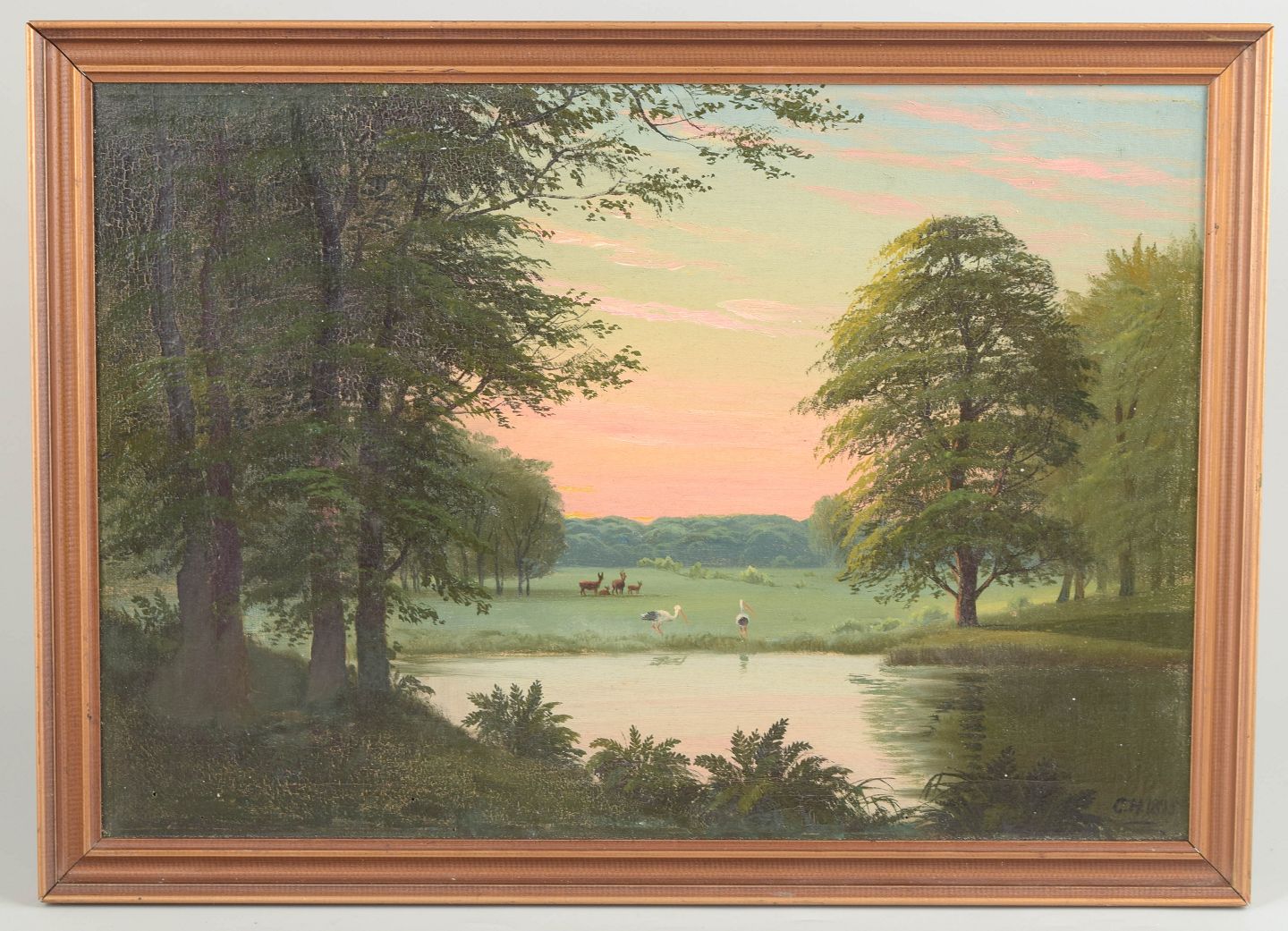 Landskabsmotiv fra Dyrehaven med sø, træer og hjorte i et stemningsfuldt skumringslys, udført som oliemaleri på lærred og signeret nederst til højre.