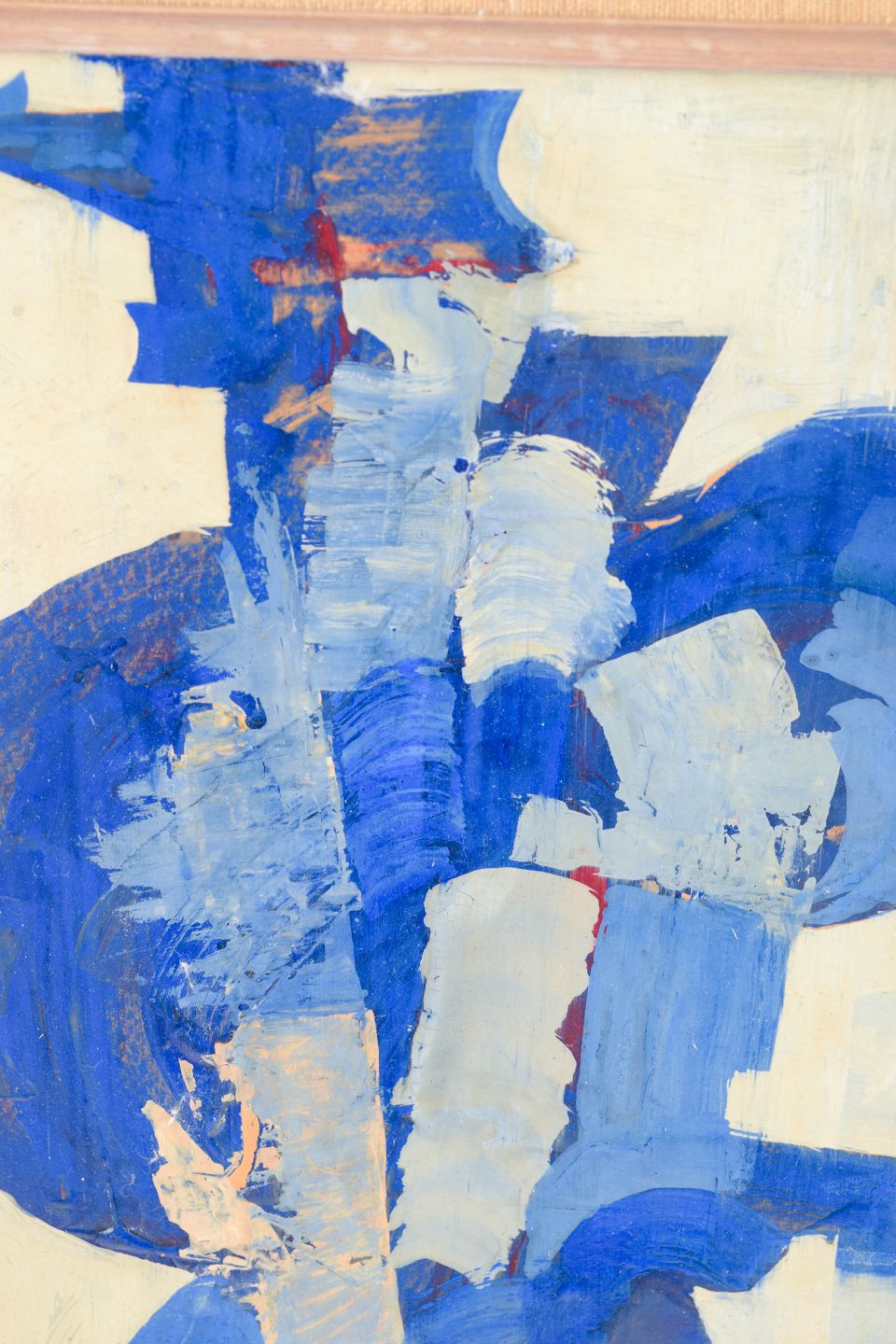 Abstrakt, modernistisk komposition udført i olie på plade med dynamiske, lagdelte penselstrøg i blå og hvide nuancer, signeret og indrammet.
