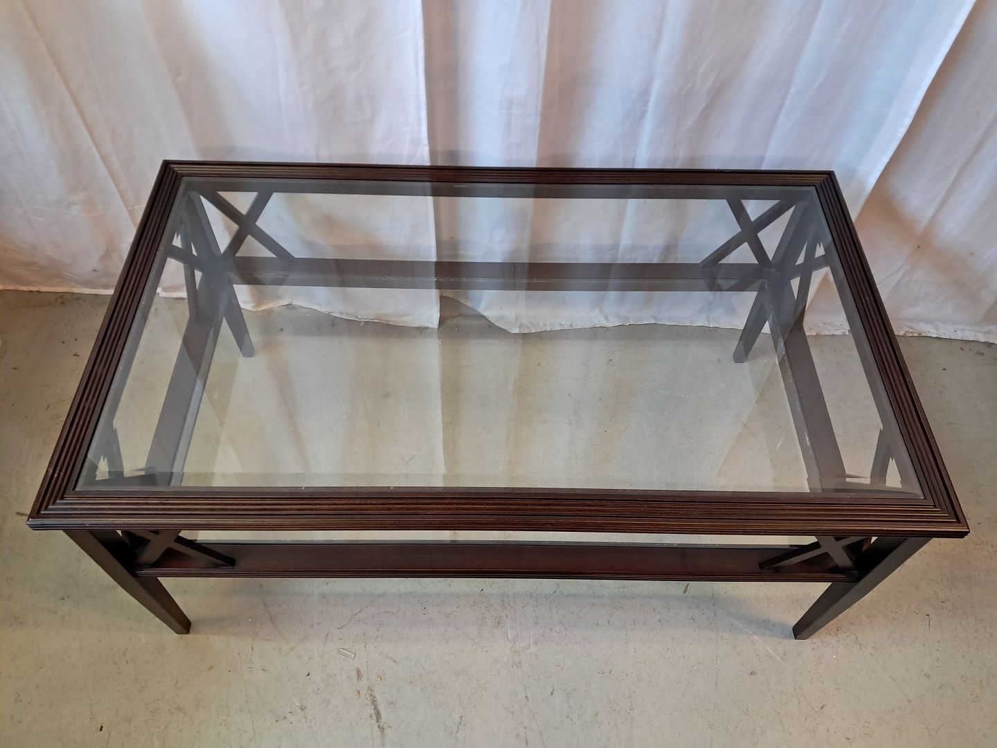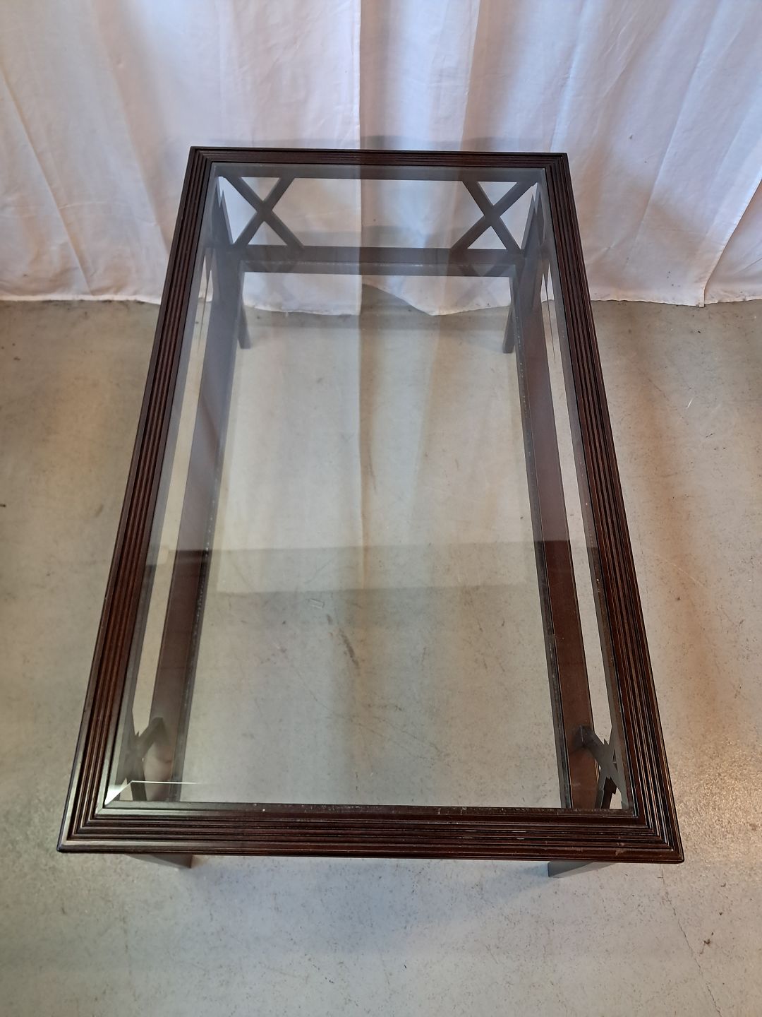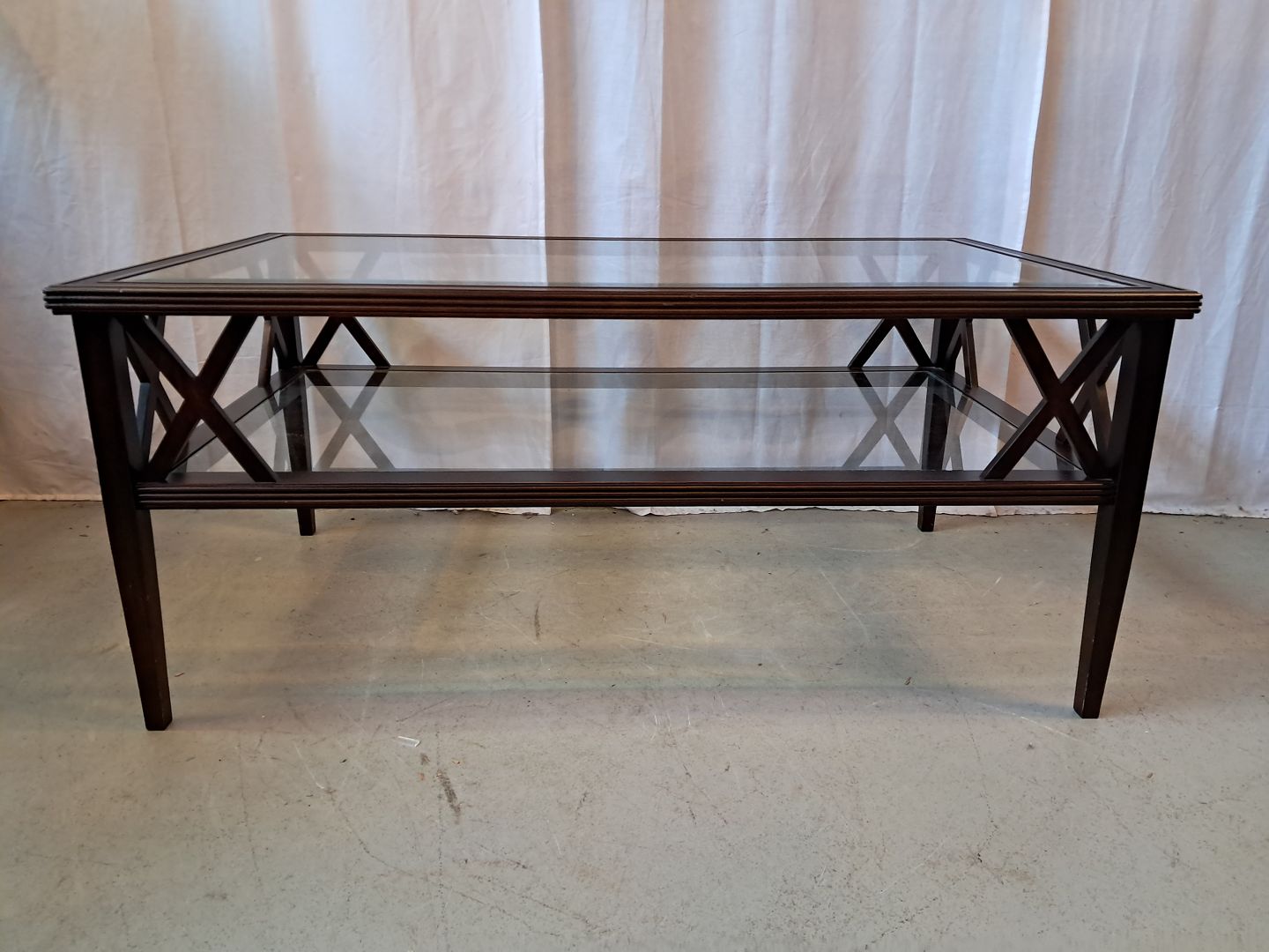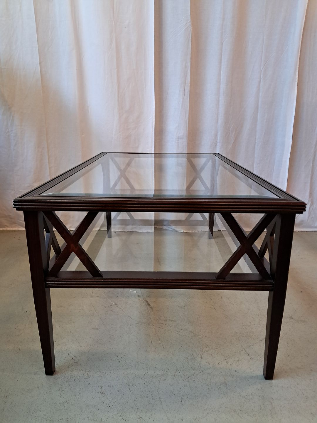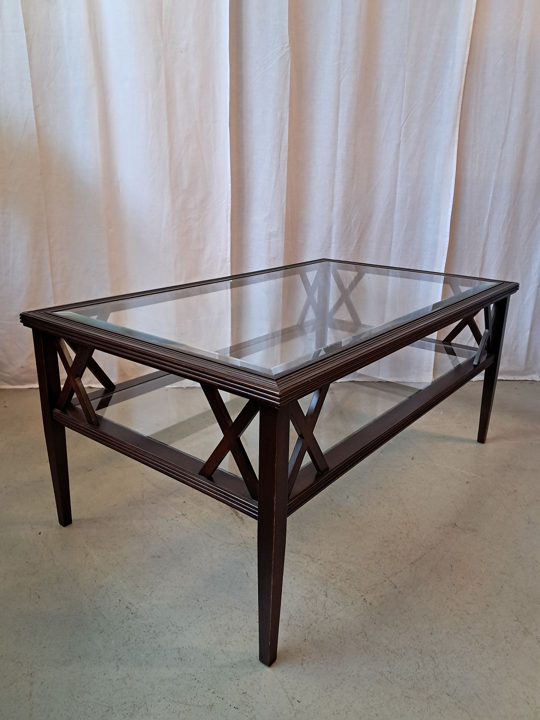 Sofabord i fineret mahogni med 2 glasplader, fra 2000erne.
