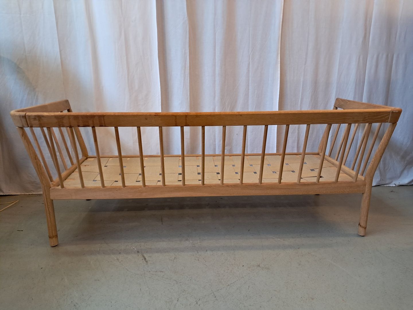 Sofa i massivt egetræ med hynder af kunst-rugskind, fra 2000erne.