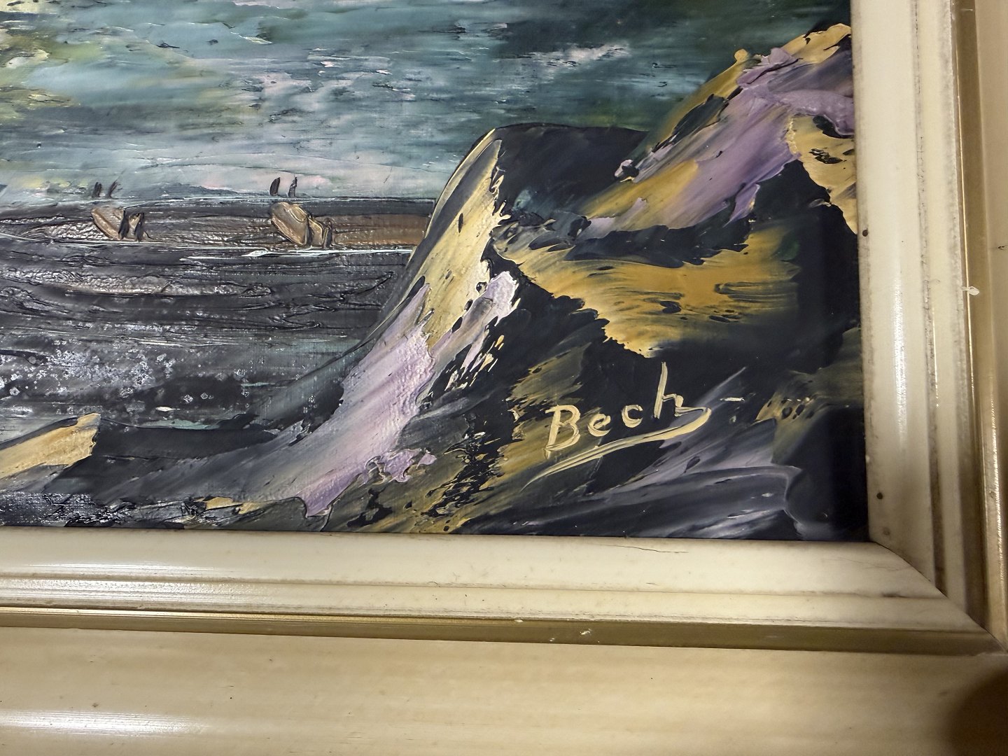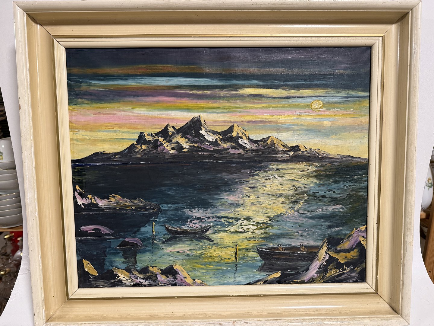 Bech Vogt-Sørensen (1919-?), Oliemaleri på lærred af hav og ø i måneskin, signeret Bech, Mål med ramme: 56,5x47,5cm