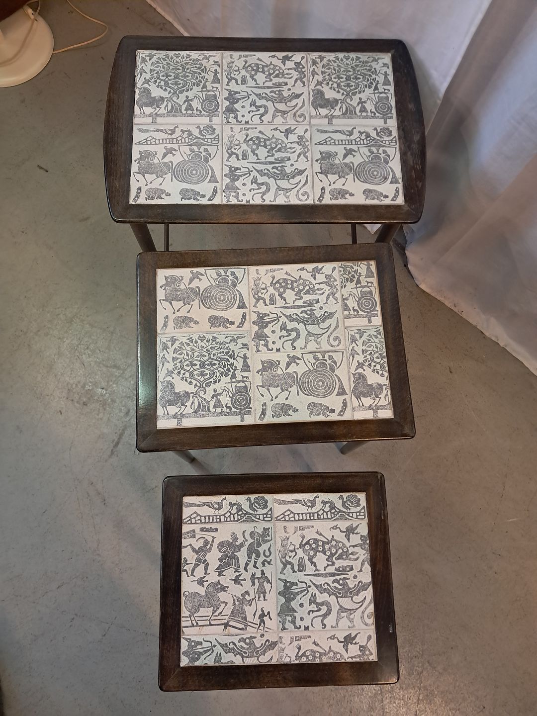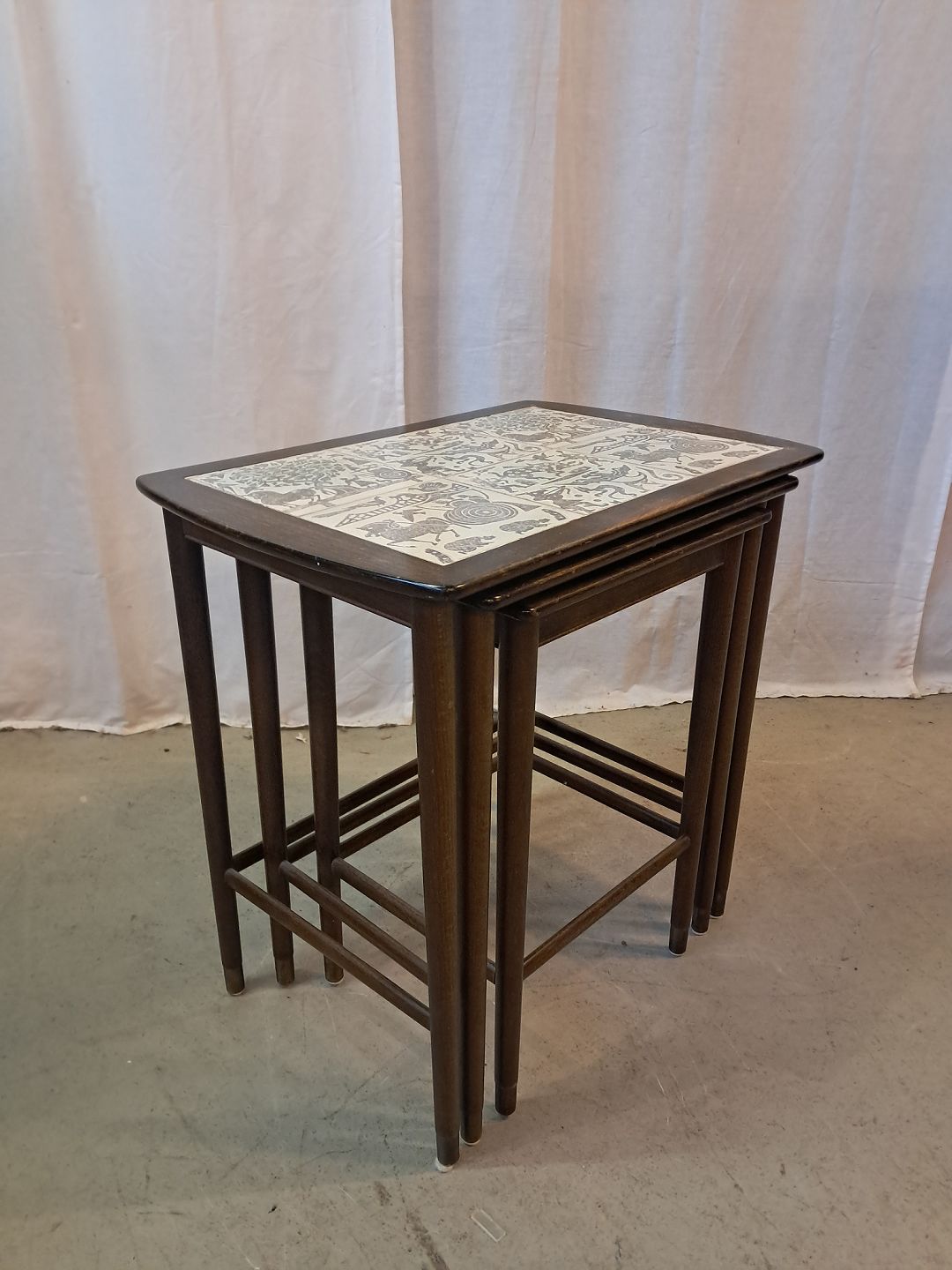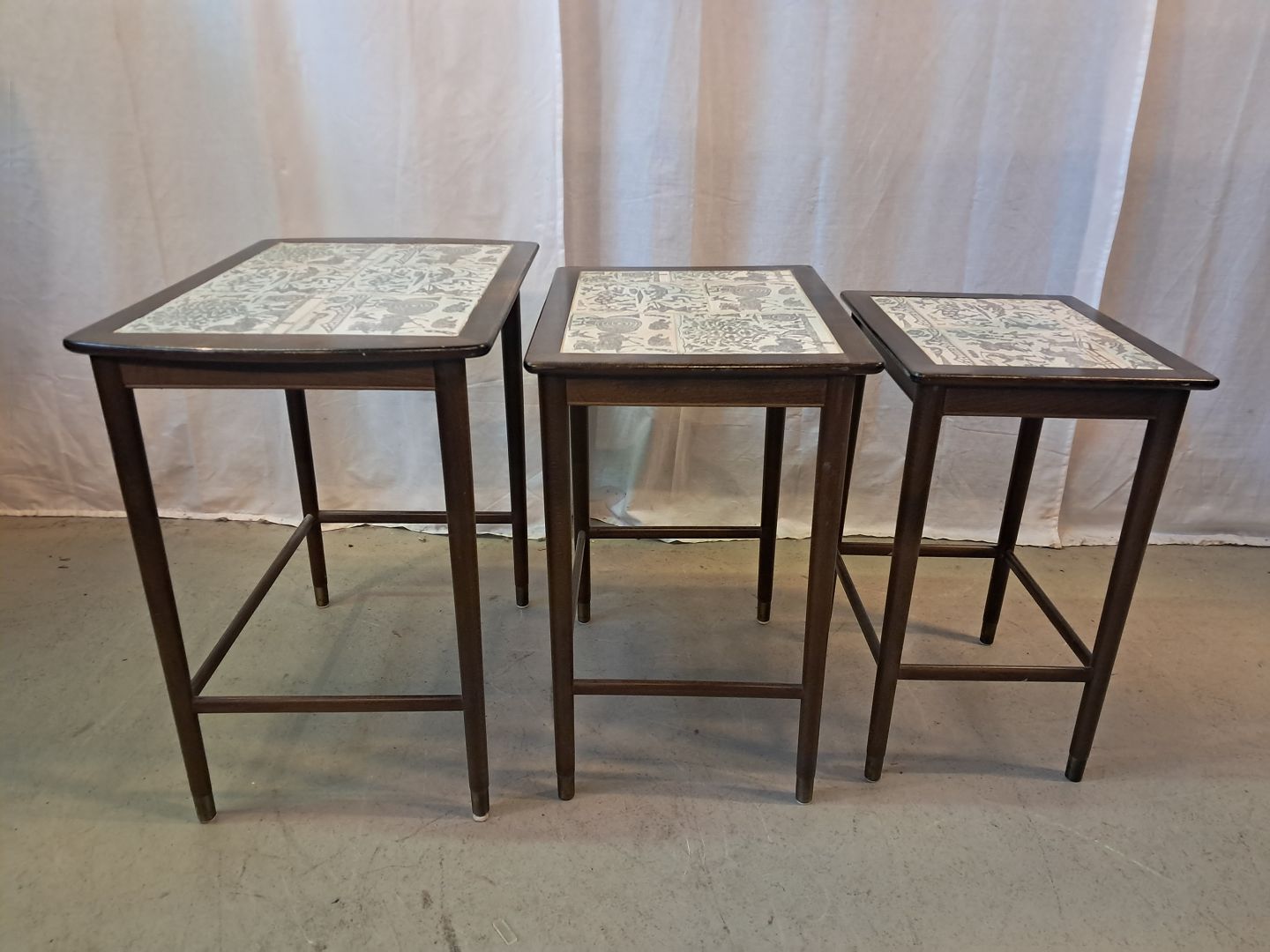 3 Indskudsborde i nødetræ med kakler, fra 1950erne.