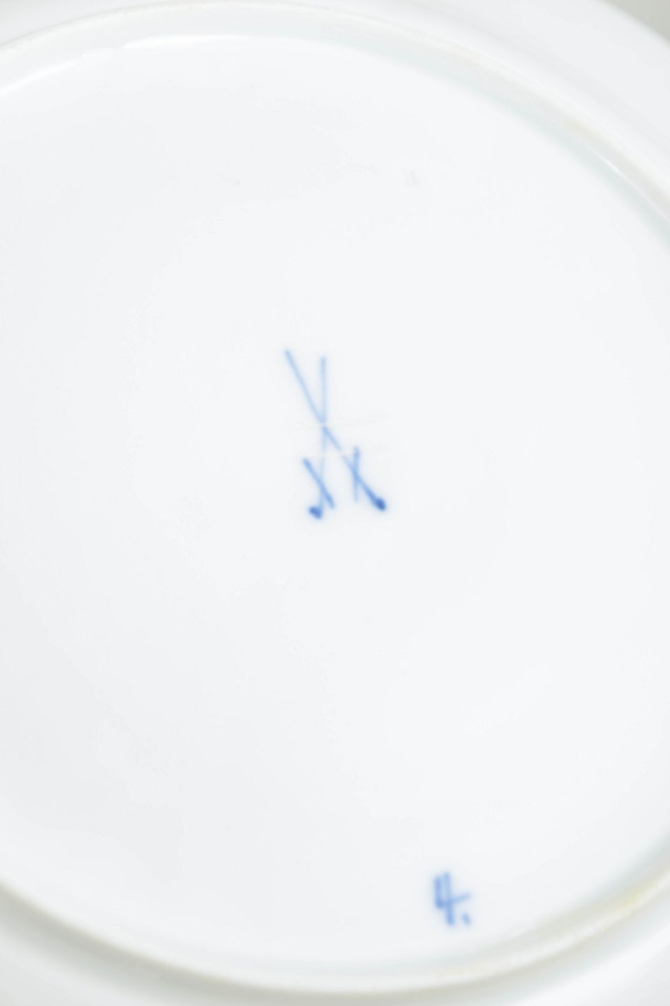 Middagstallerkener i hvidt porcelæn dekoreret i underglasur, løgmønster med bølget fane. Mærket i bunden med Meissens krydsede sværd.