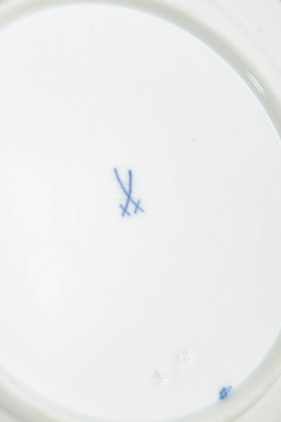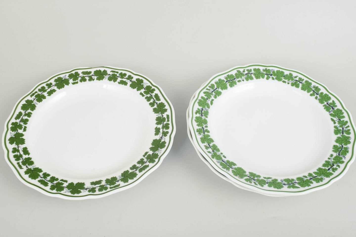 Runde porcelænstallerkener dekoreret med grøn vinløvsbort langs kanten. Nogle eksemplarer annulleret med to indridsede streger, andre med fire indridsede streger. Mærket med Meissens krydsede sværd. Én tallerken med et meget lille og ubetydeligt skår, se foto.