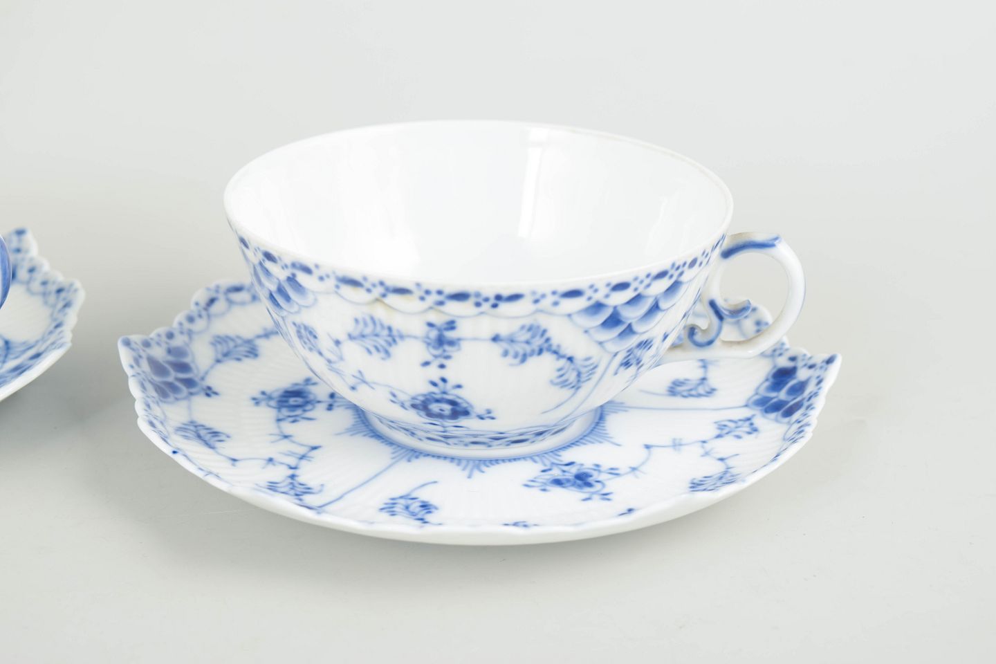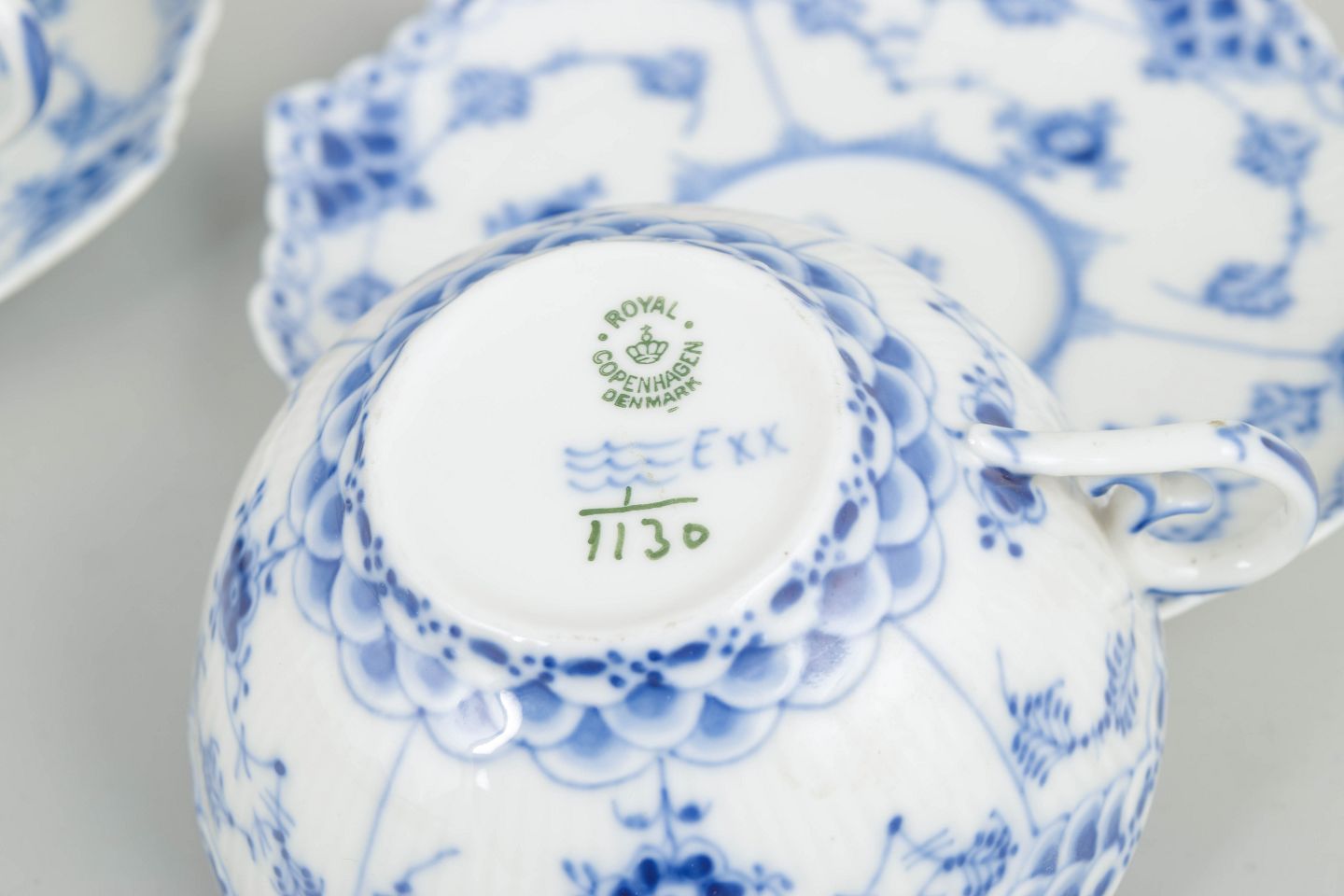 To tekopper med matchende underkopper i håndmalet underglasurblå dekoration i Musselmalet helblonde, med gennembrudt blondedekoration langs kant. Kop og underkop model 1/1130. Annulleret med én og to indridsede streger.