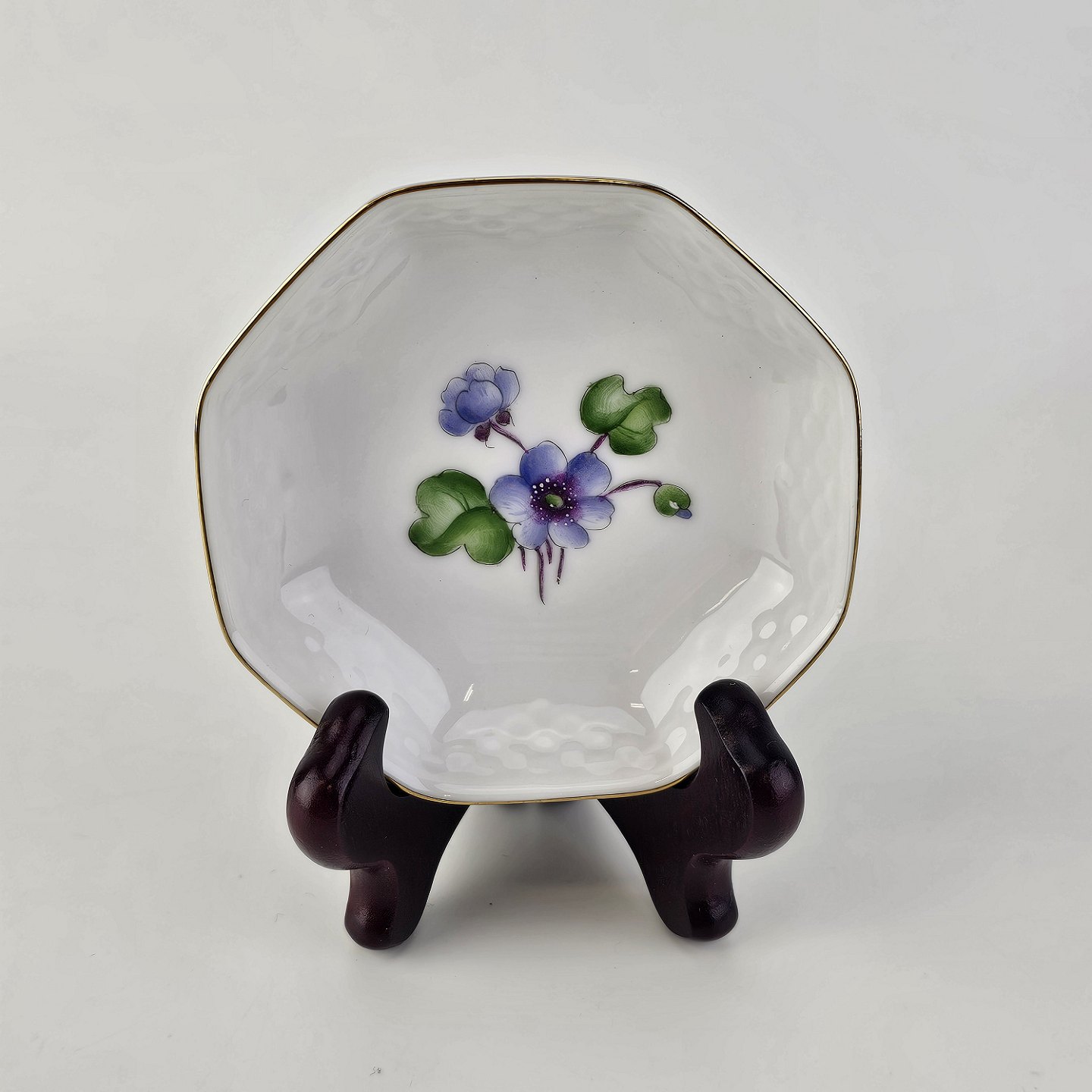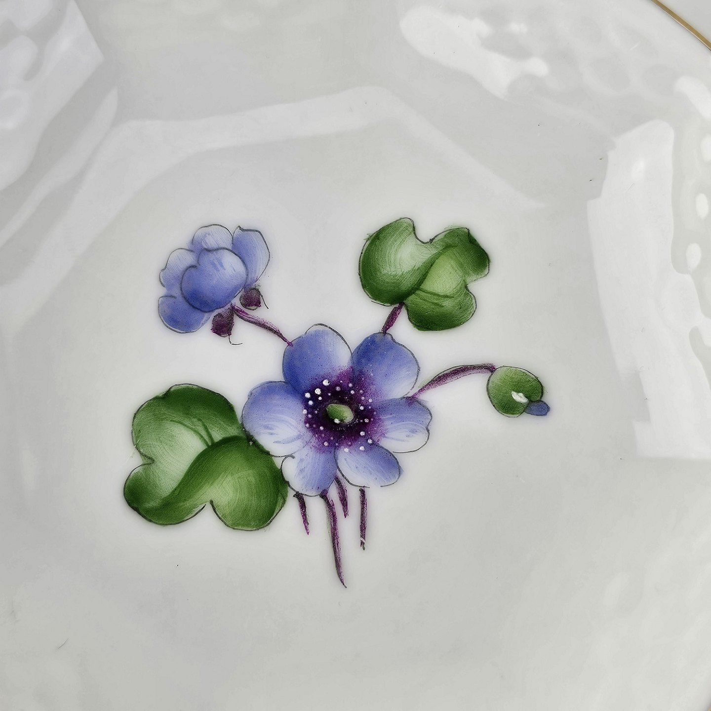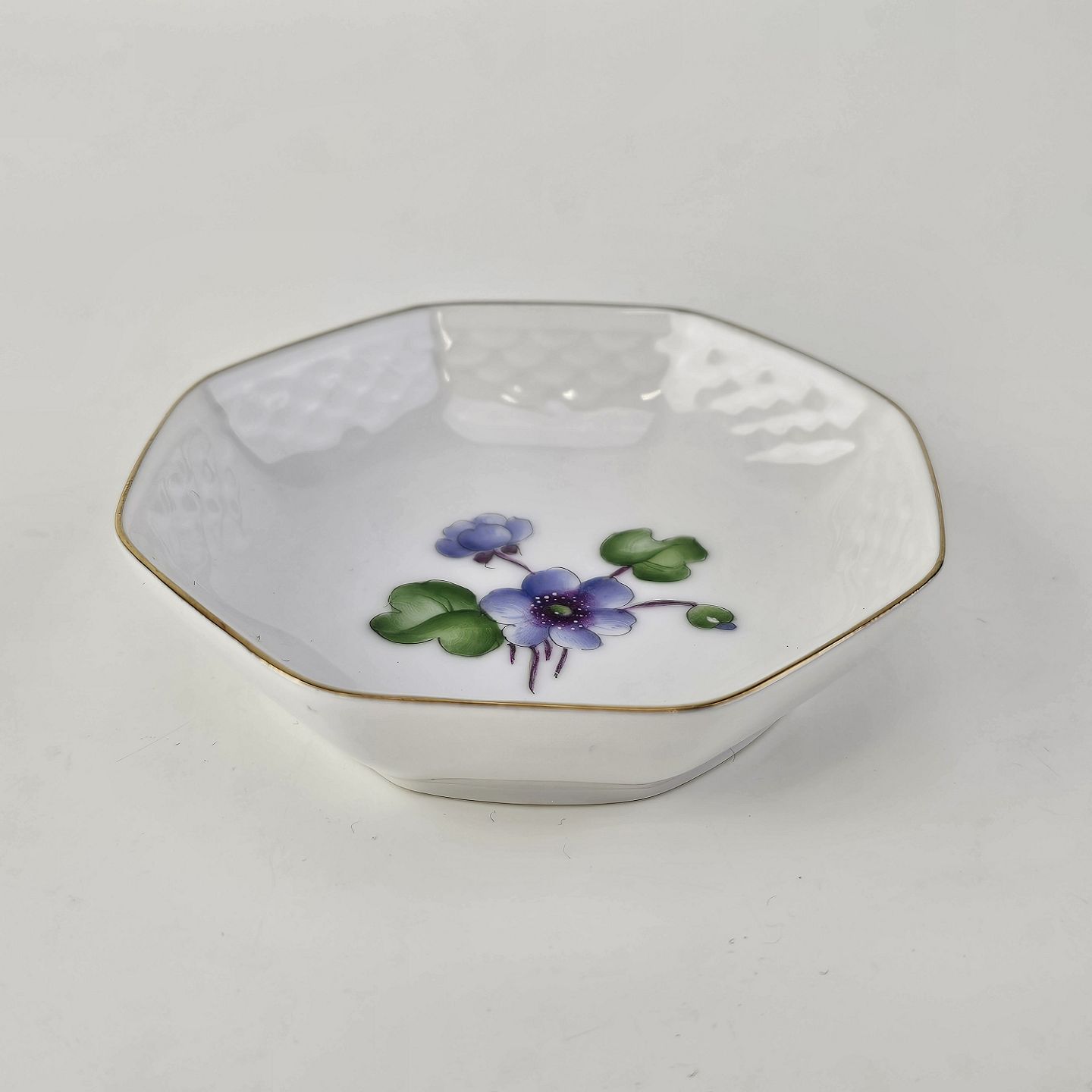 Antonius er af hvidt porcelæn med skælform dekoreret med håndmalede blå anemoner og guldkant. Også kendt under navnet Blå Anemone.