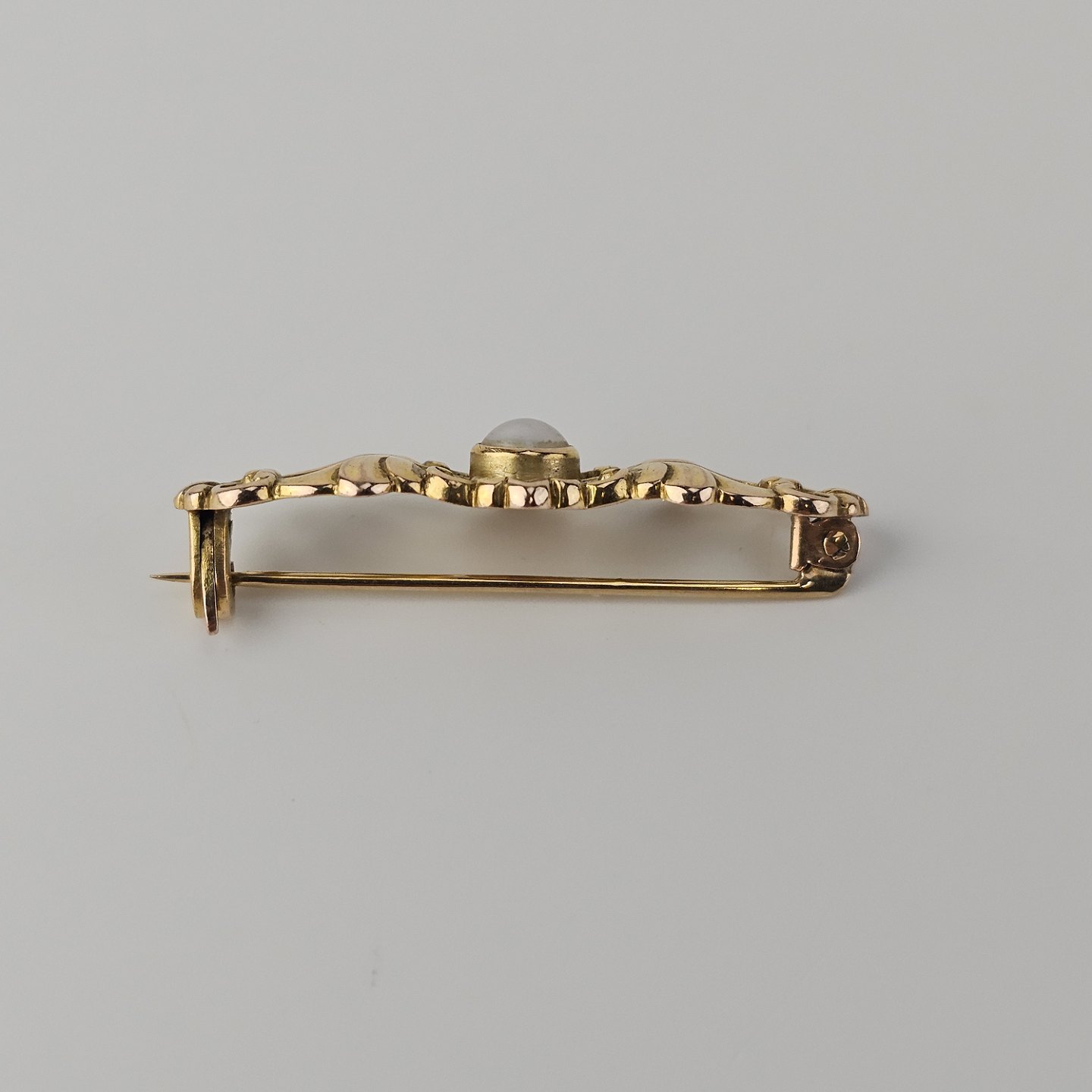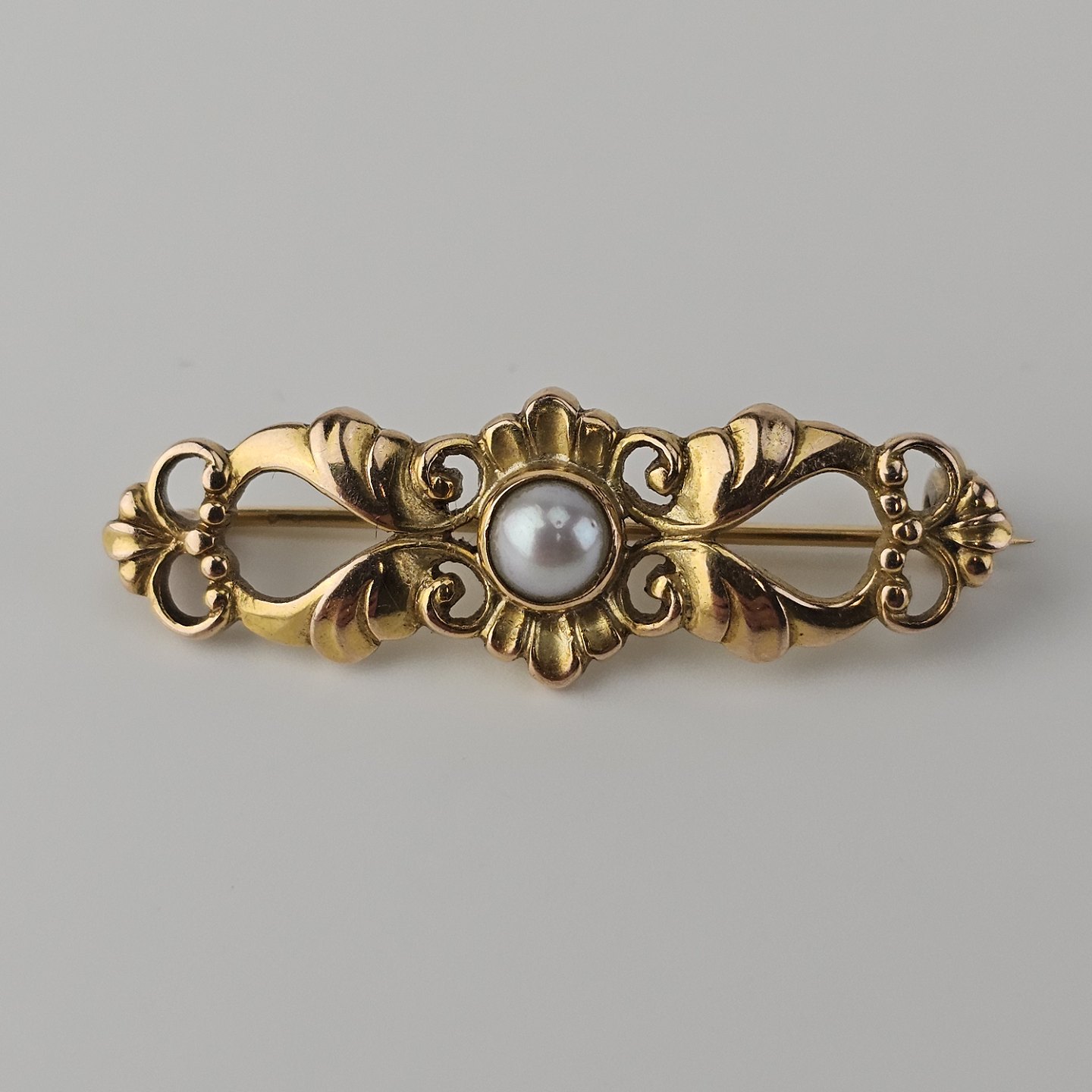 Broche i 14 karat guld dekoreret med en perle
