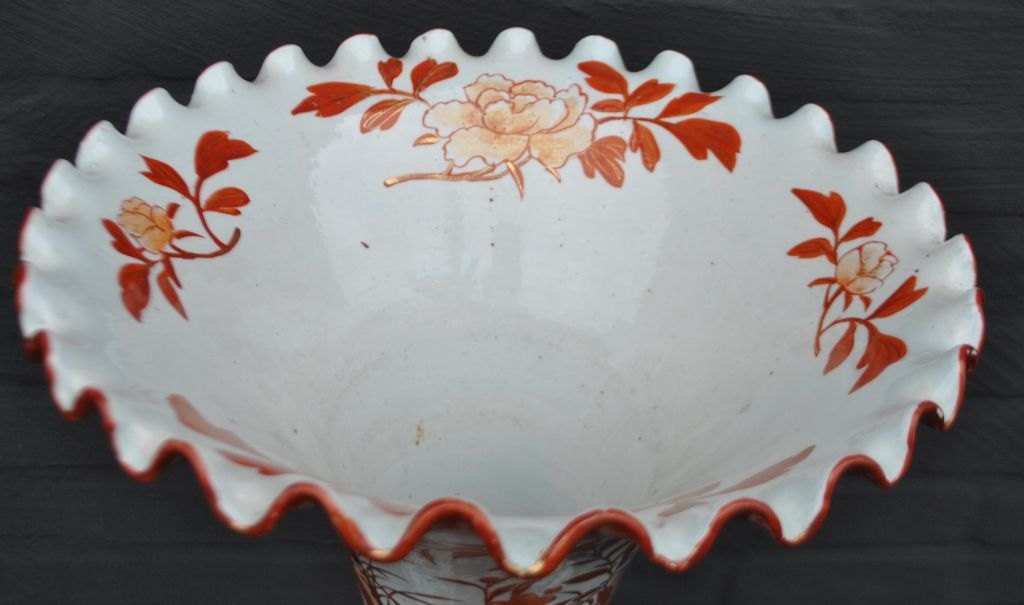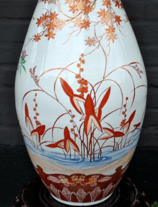 Japansk Kutani vase, 19. årh. Håndmalet. Dekoreret med bl.a. træer, blomster og fo fugl. Polykrom dekoration med forgyldninger. Bølget kant. H: 94 cm. Dia: 33,5 cm. H. inkl. fod: 113,5 cm.