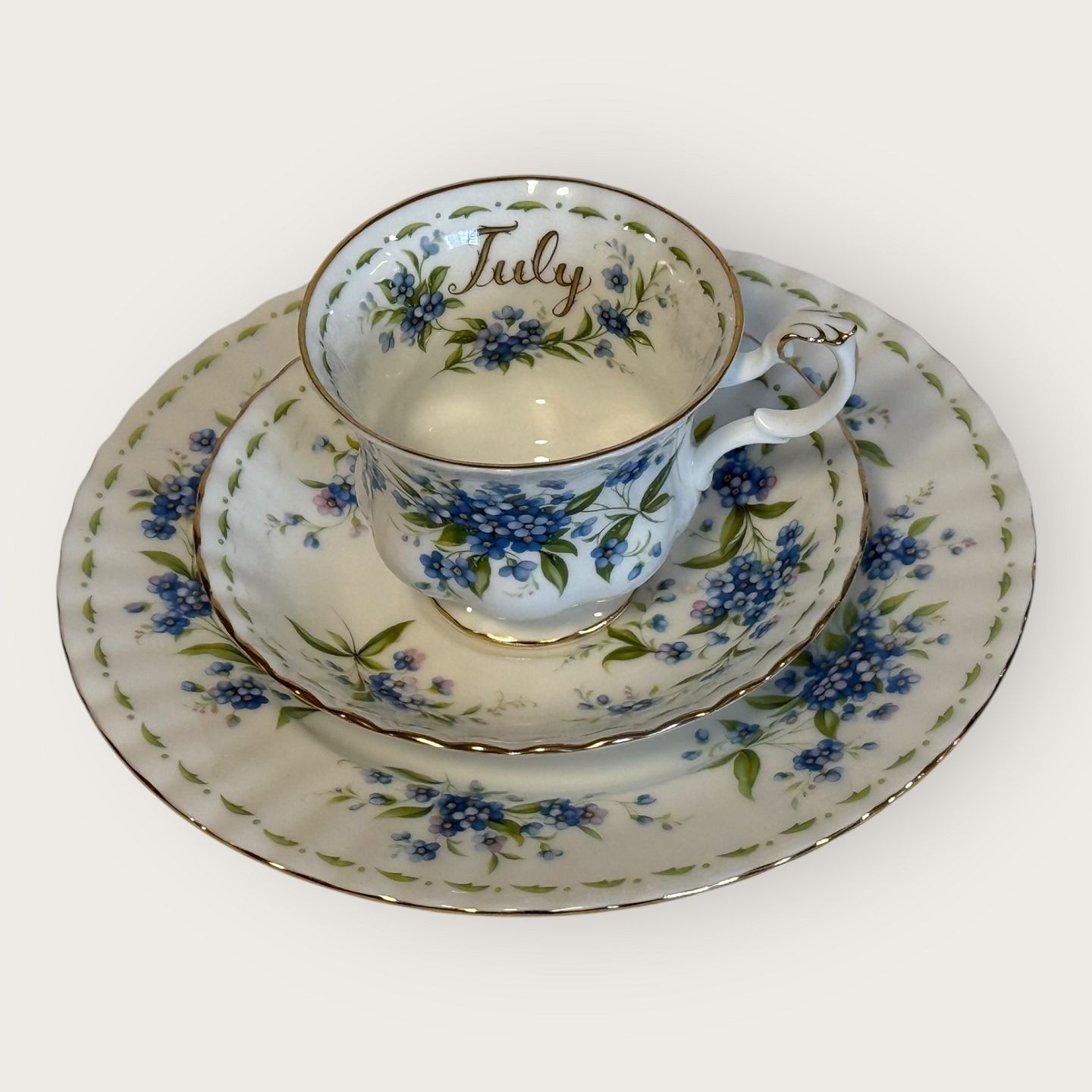 Royal Albert, Flower of the month, Trio sæt med kop, underkop og kagetallerken, tallerken har diameter 20,5cm, koppen har diameter 9cm og højde 7cm *Fremstår i perfekt stand*