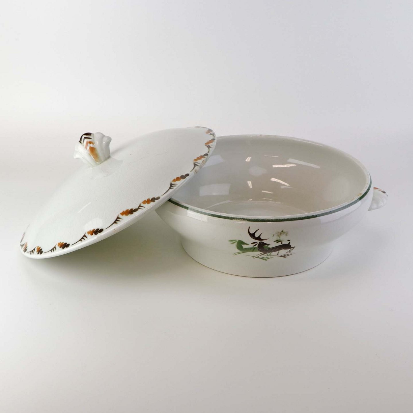 Terrin med låg i fajance fra Hjortestellet Convolvolus, som blev fremstillet i perioden 1930-1940