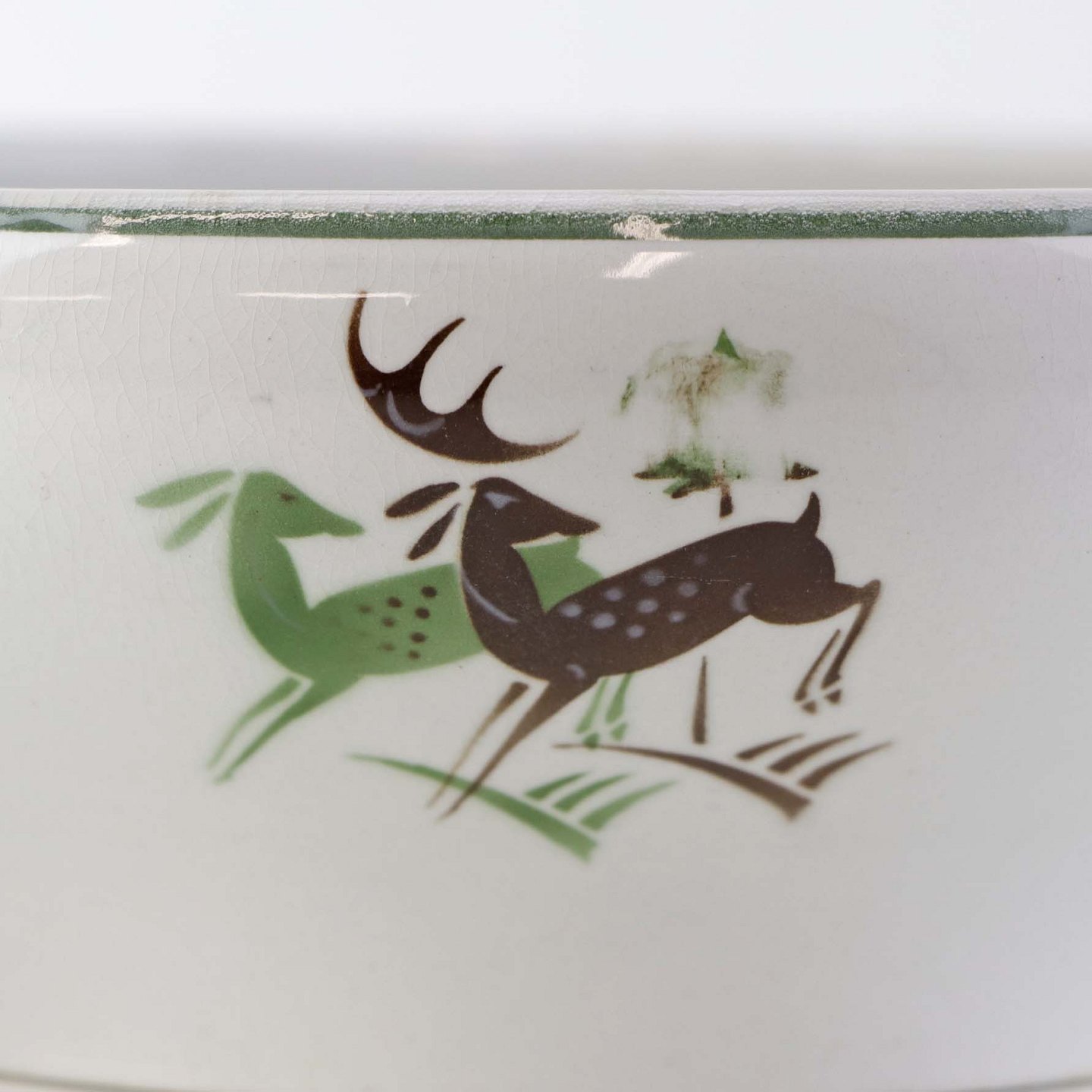 Fajancestel i stelform C med dekoration af grøn og brun hjort på lys baggrund med kantbort af blade i brune nuancer.