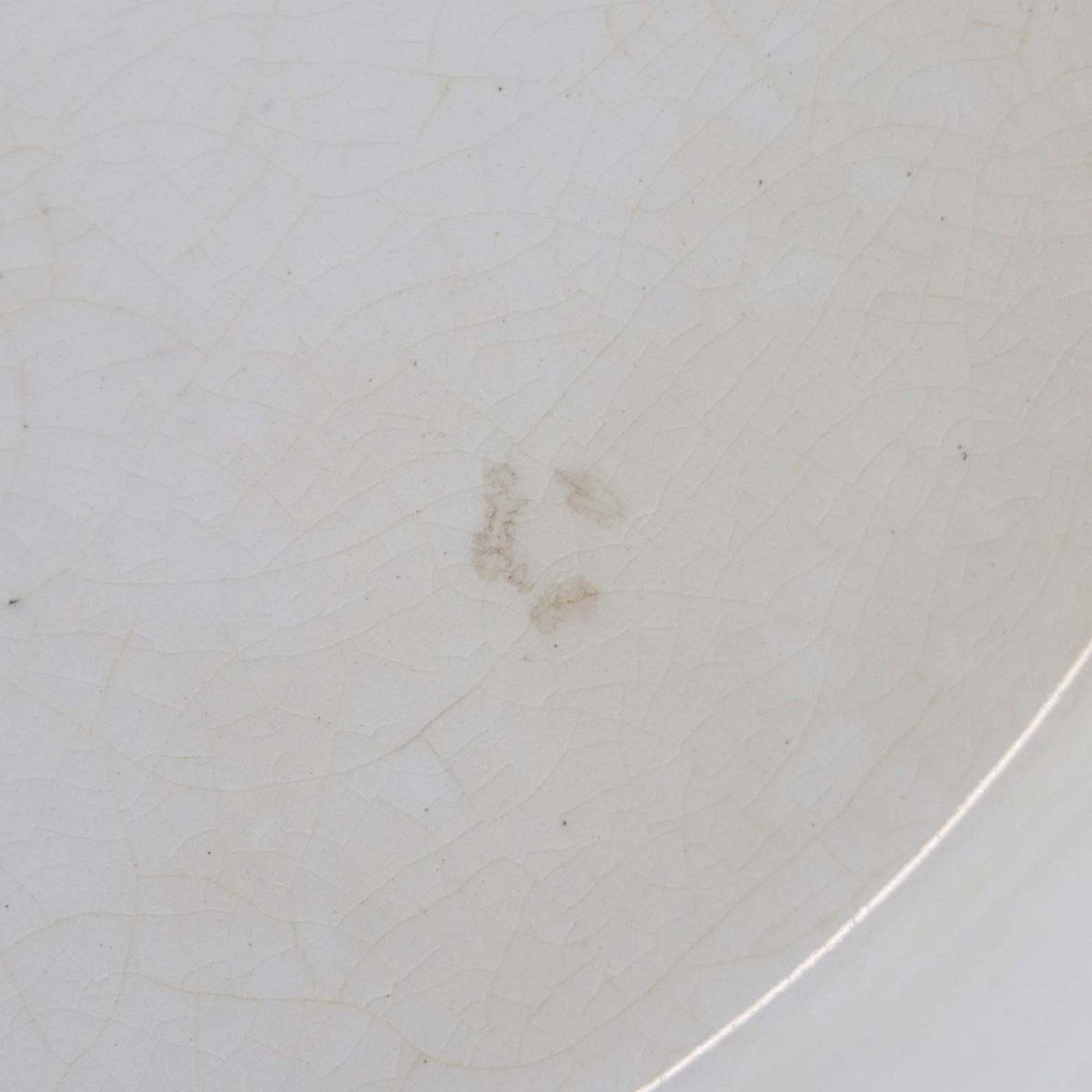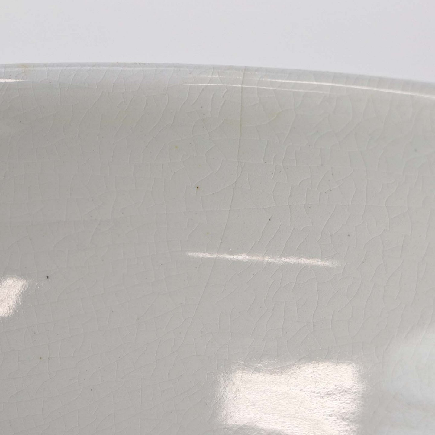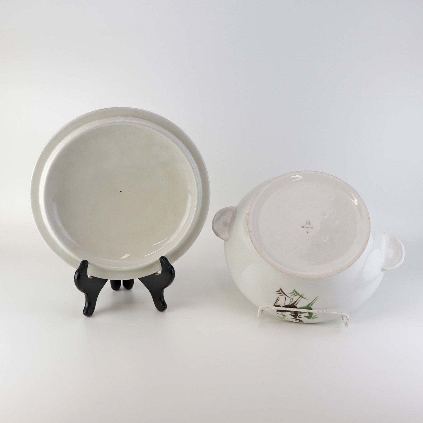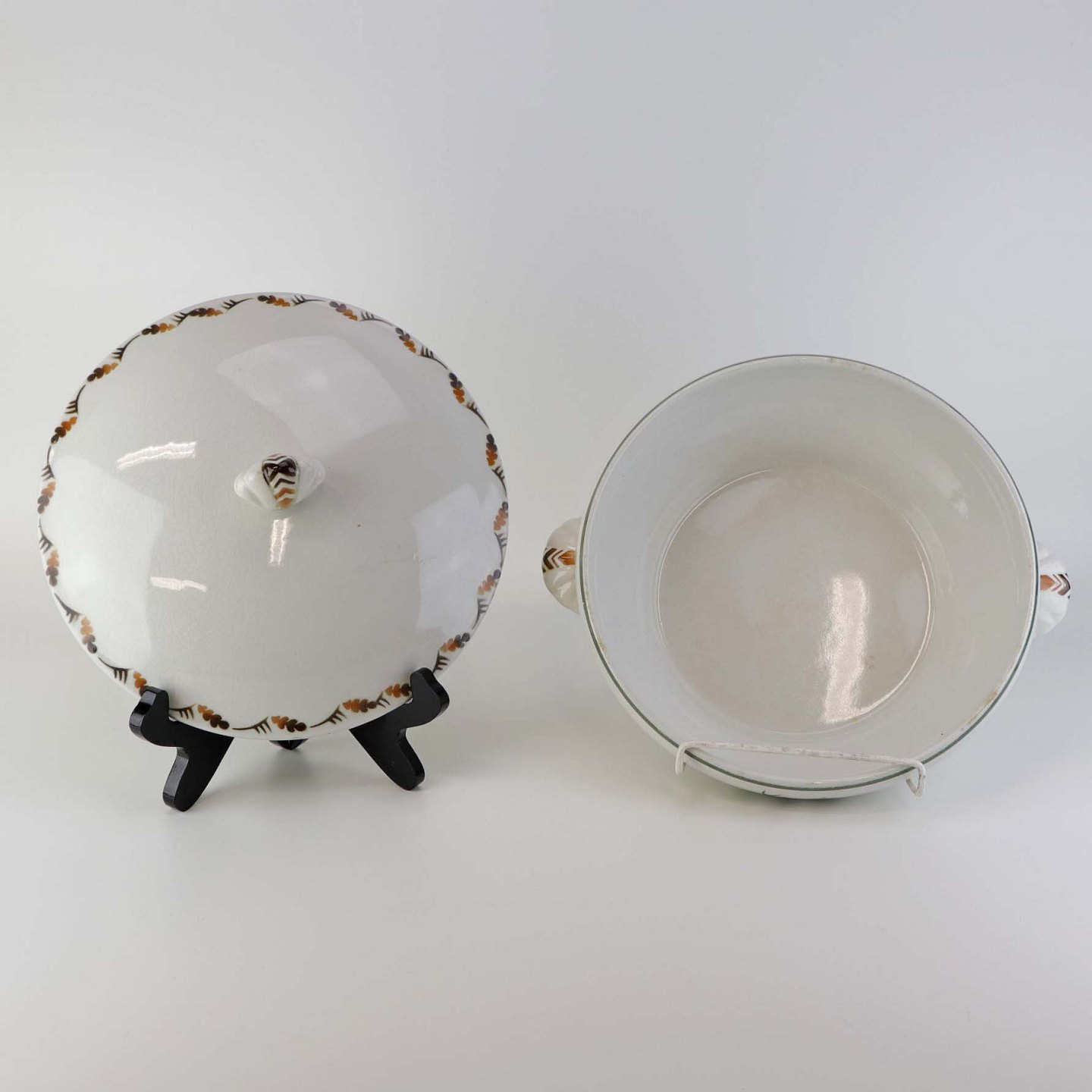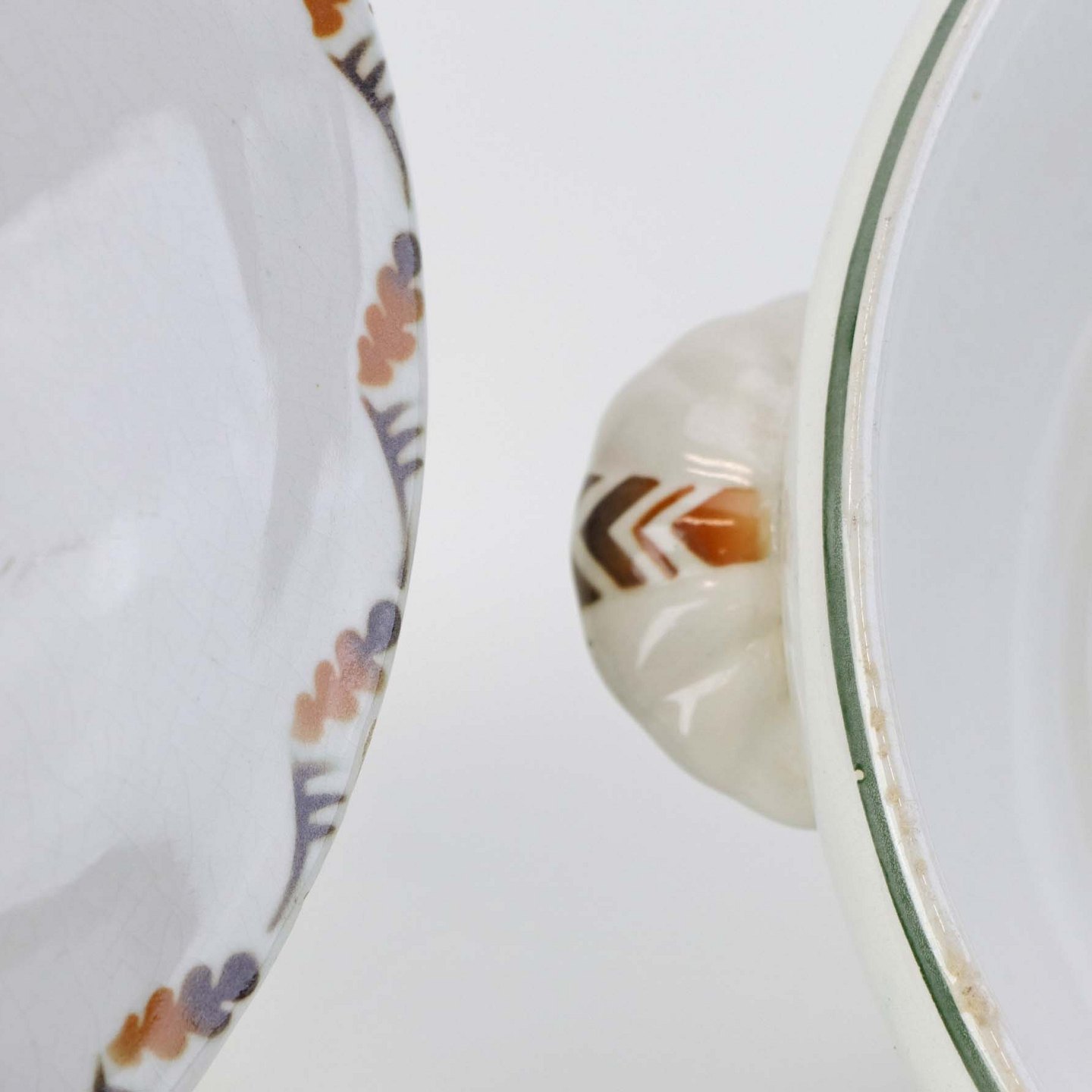 Fremstår med brugsspor på dekorationen og topkanten, krakkeleringer i glasuren og hårfin gennemgående revne ved toppen af terrinen.