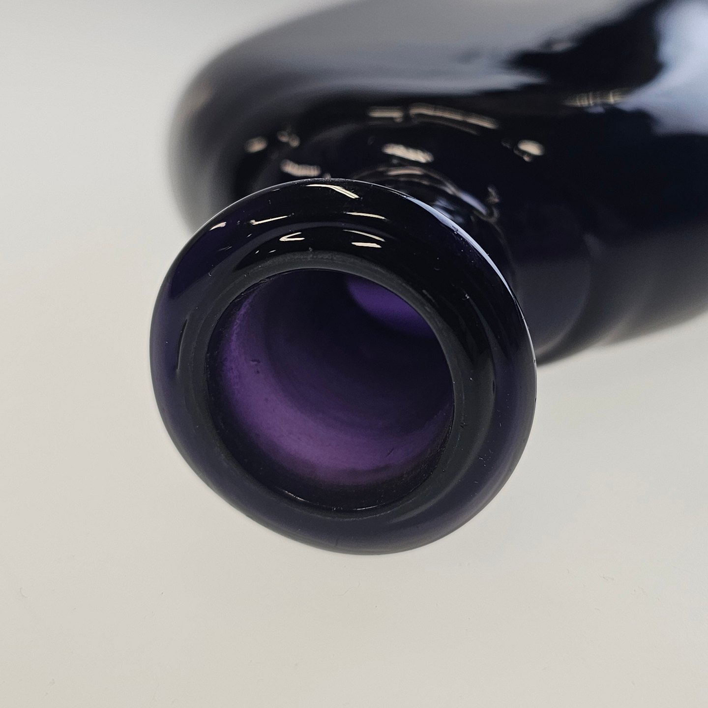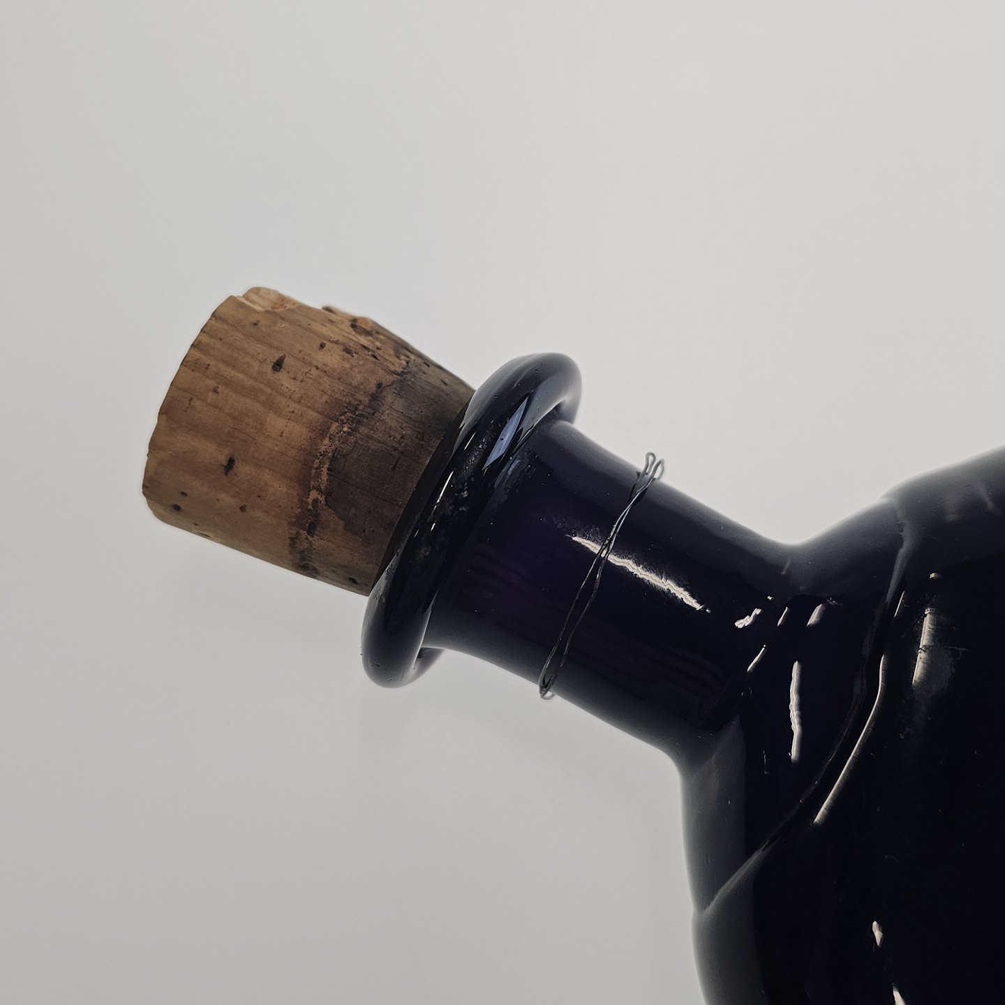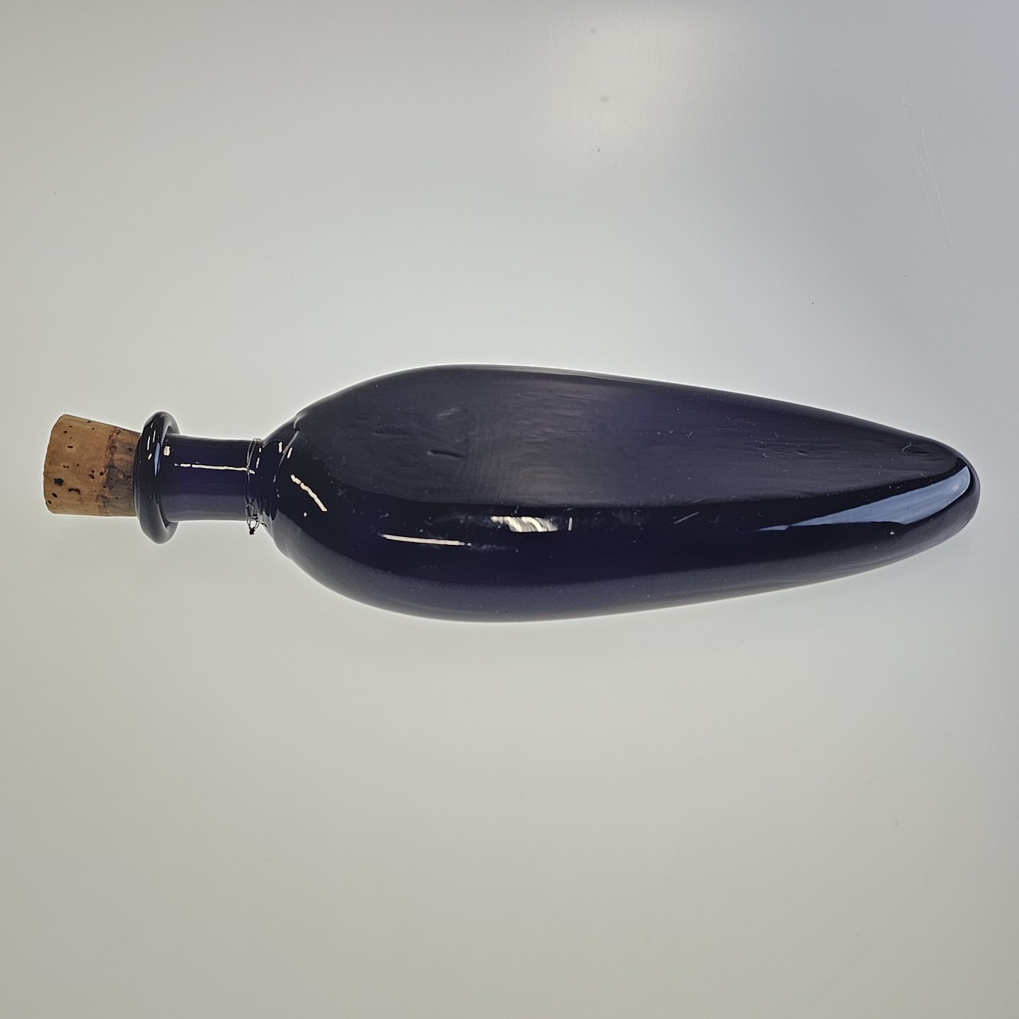Håndblæst dråbeformet flaske i lilla glas med korkprop
