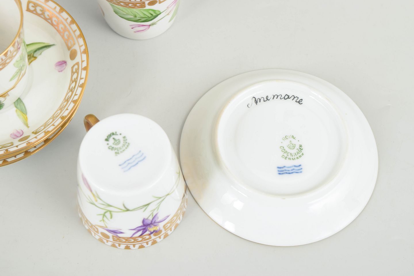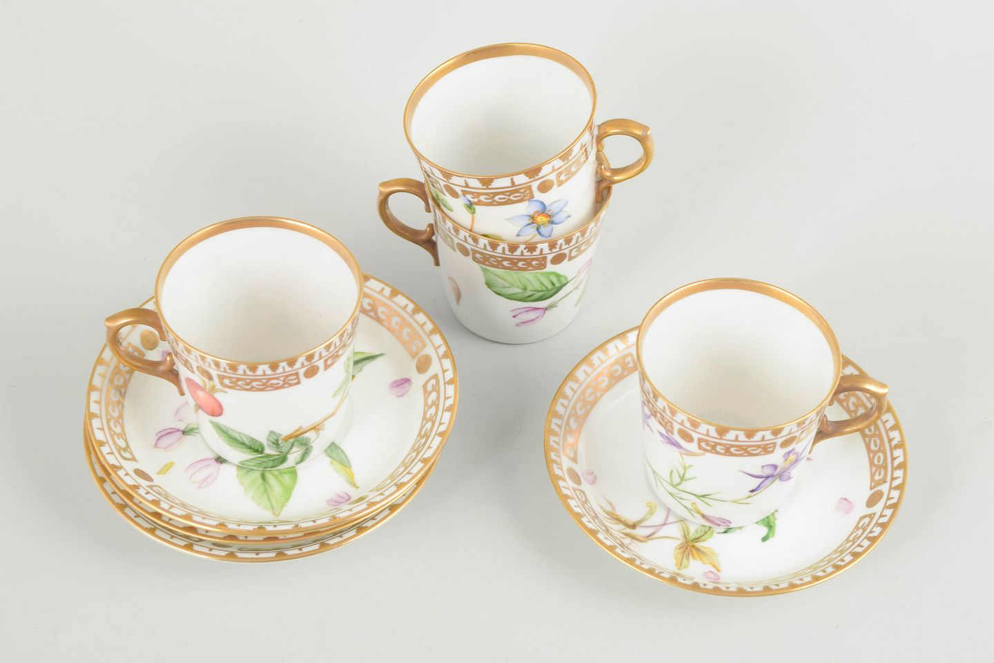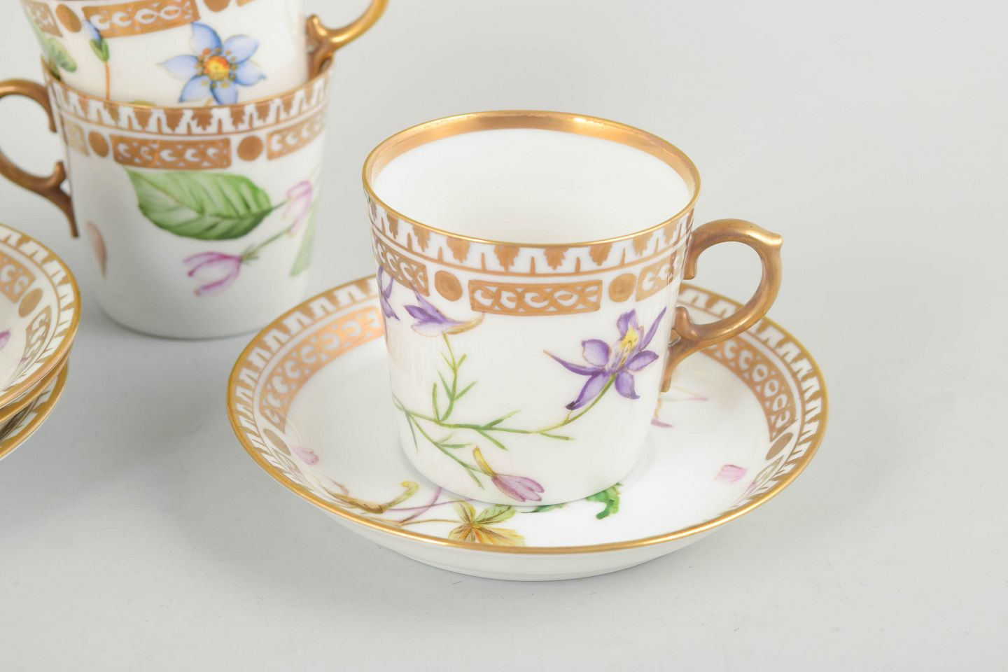 Porcelæn i Flora Danica-stil med håndmalede botaniske motiver og forgyldt kant.