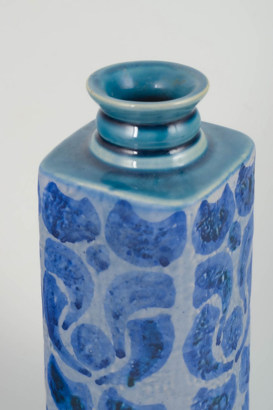 Cylinderformet vase i stentøj med lysegrå bundglasur og hånddekoreret blåt mønster i organiske, gentagne former. Kort hals med let profileret munding. Stemplet i bunden med UE Sweden, Upsala Verkstad samt modelnummer 7052 G.