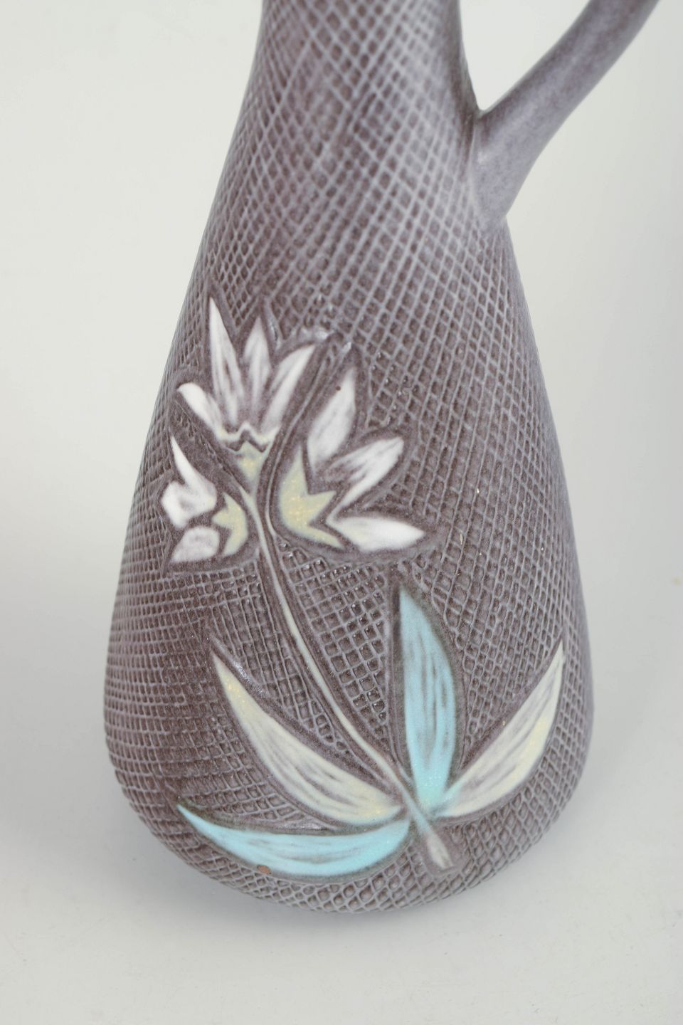 Elegant kande i stentøj med gråviolet, fint tekstureret overflade og reliefdekoration med stiliserede blade i lyse turkise og hvide toner. Organisk, slank form med integreret hank. Modellen er stemplet i bunden og bærer modelnummer 4499.