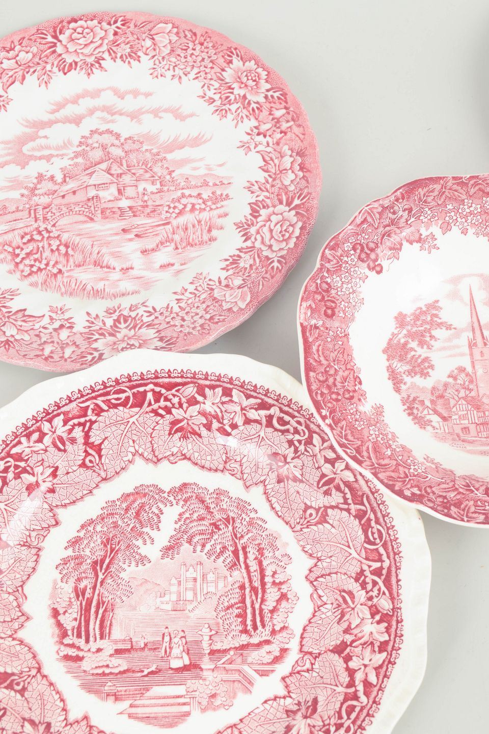 Sæt i fajance bestående af tallerkener og skål, dekoreret i rød transferware med landskabs- og ornamentmotiver fra forskellige engelske producenter, herunder Mason’s.