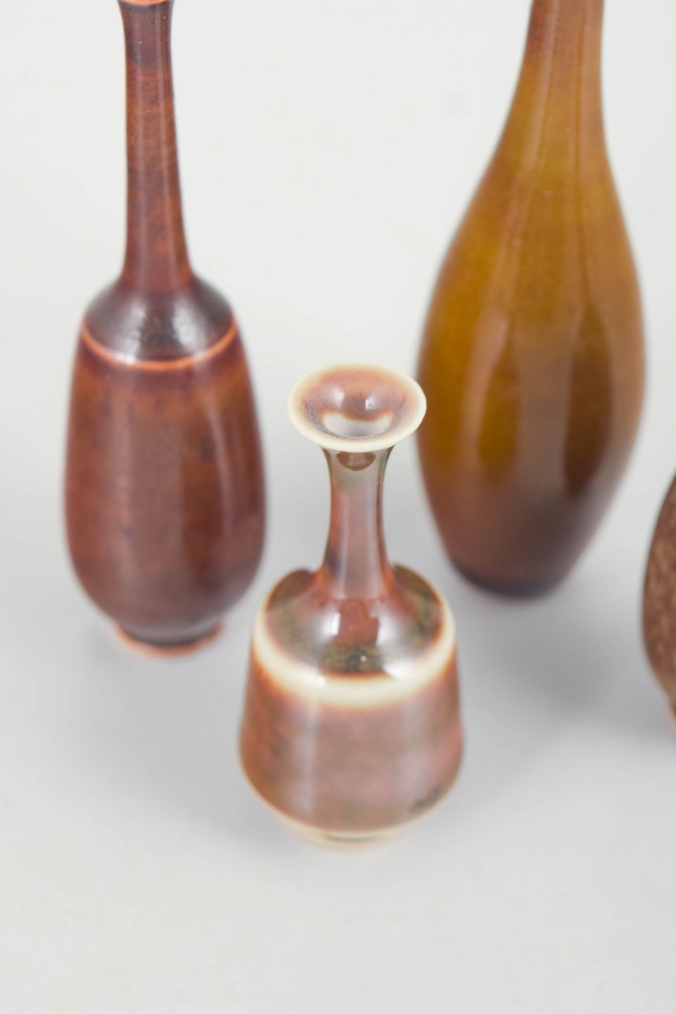Små drejede stentøjsvaser i slanke og harmoniske former med levende glasurer i varme jordtoner. Typiske for Höganäs’ studioproduktion, hvor proportion, materialitet og glasurens spil er i fokus.