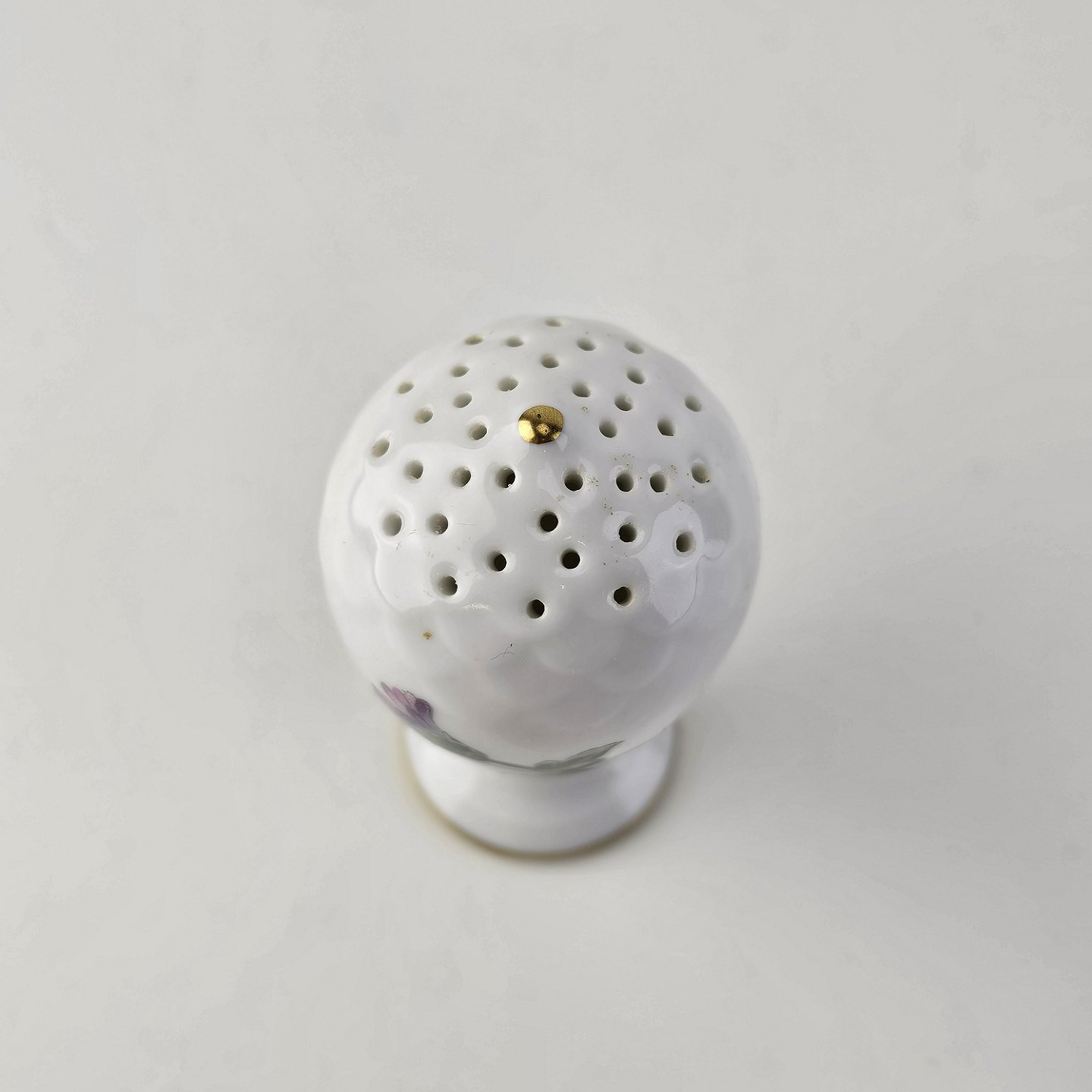 Krysantemum er hvidt porcelæn dekoreret med lys lilla blomst, grønne blade og guldkant.