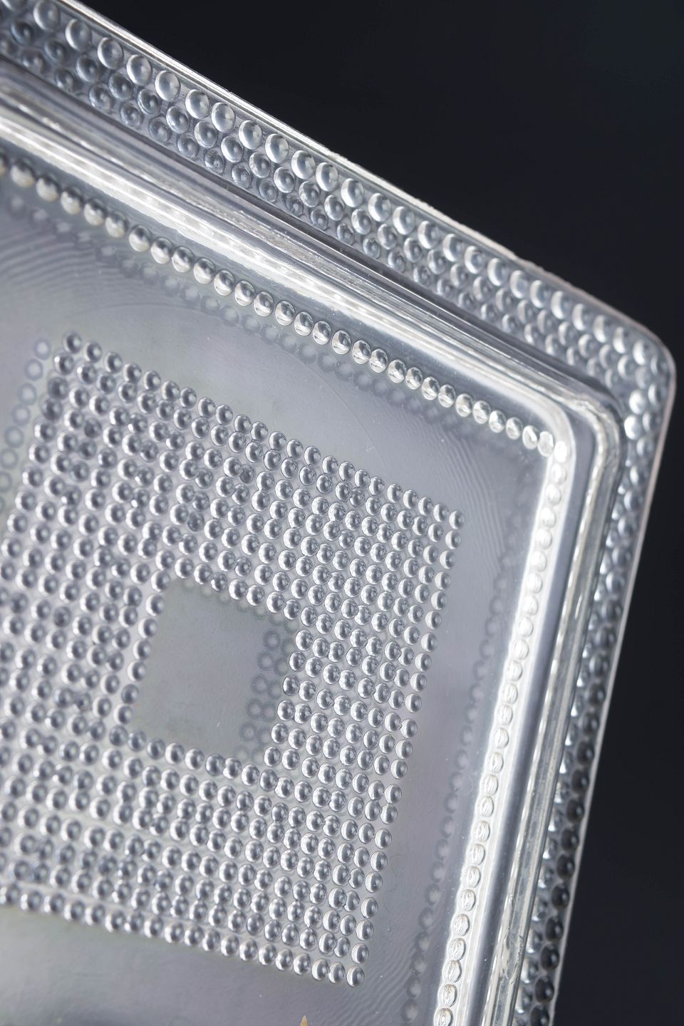 Sæt på tre kvadratiske tallerkener i klart kunstglas med geometrisk relief og markeret midterfelt. Fremstillet i presset glas.