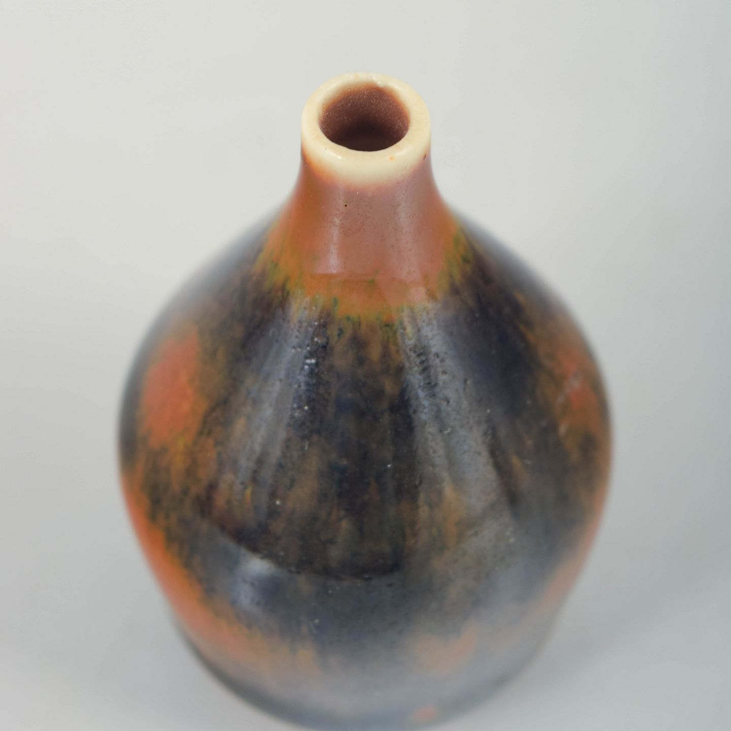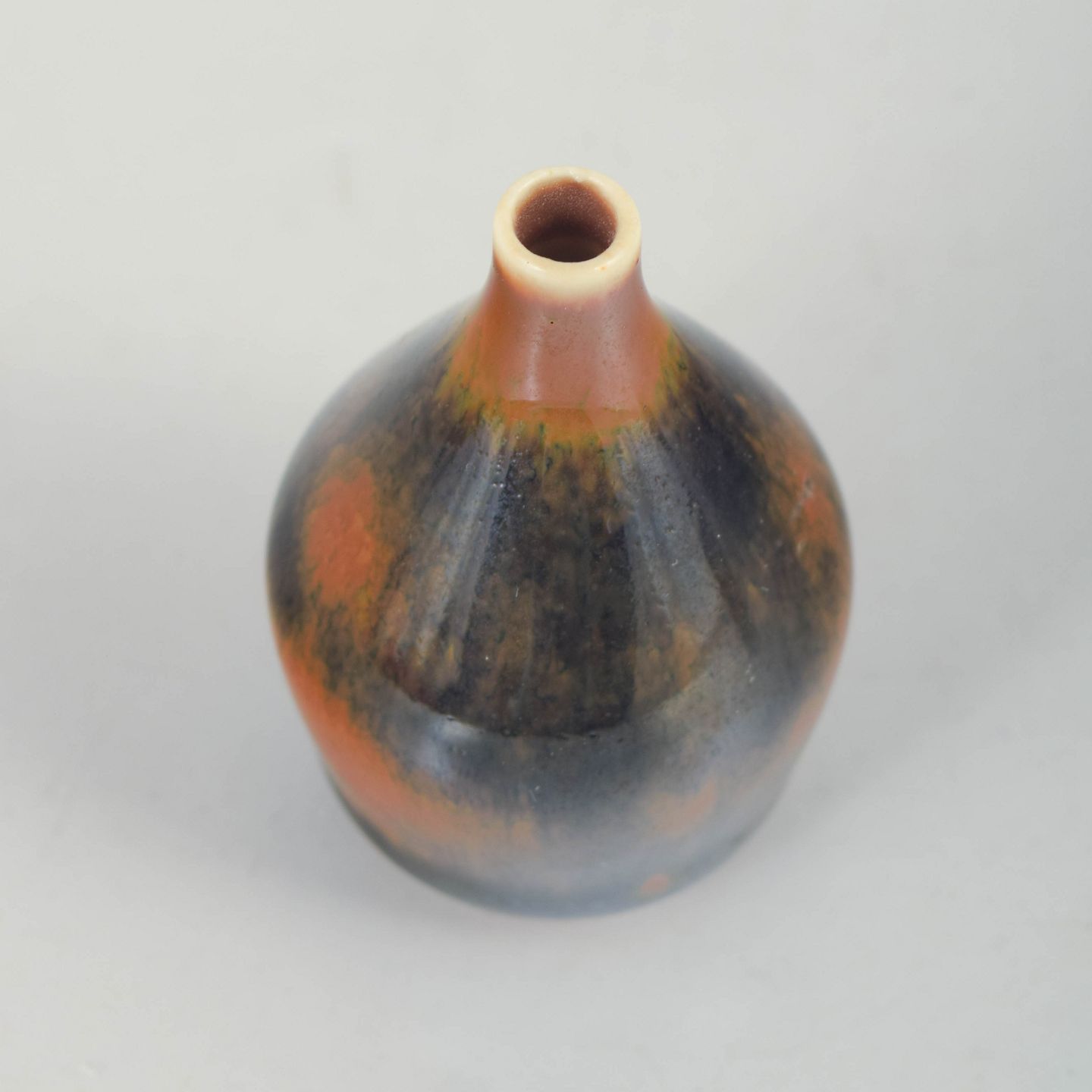 Miniaturevase i stentøj med blank glasur i dybe blågrå og varme brunlige toner, balusterformet krop og smal hals. Undersiden stemplet Rörstrand, Sweden.
