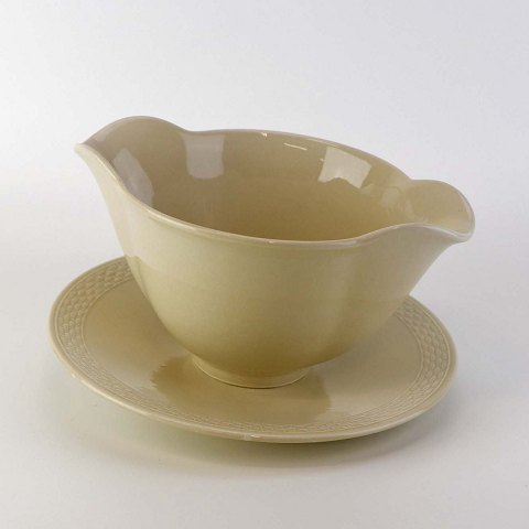 Sandfarvet fajancestel i stelform Viktoria II - Fletværk med dekoration af hvidt flet på gullig baggrund.