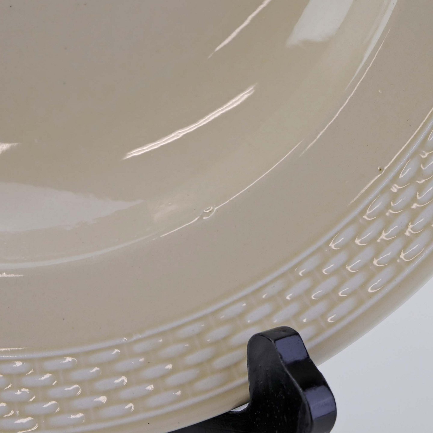 Sandfarvet fajancestel i stelform Viktoria II - Fletværk med dekoration af hvidt flet på gullig baggrund.