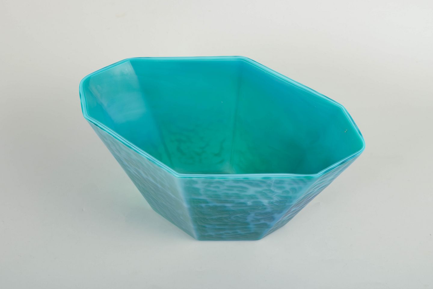 Stor ottekantet skål i kraftigt kunstglas med levende turkisblå nuancer og marmoreret struktur. Fremstillet hos Pukeberg Glasbruk og bevaret med original mærkat.