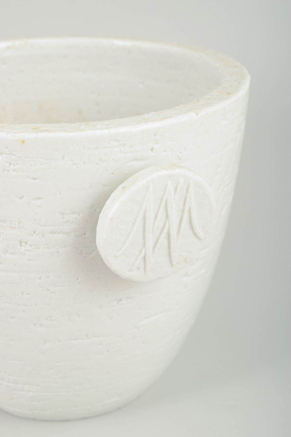 Stor cylindrisk champagnekøler/isspand i hvidglaseret stentøj med let konisk korpus og to markante sidehanke. Overfladen fremstår med diskret struktur og mat hvid glasur. Stemplet i bunden.