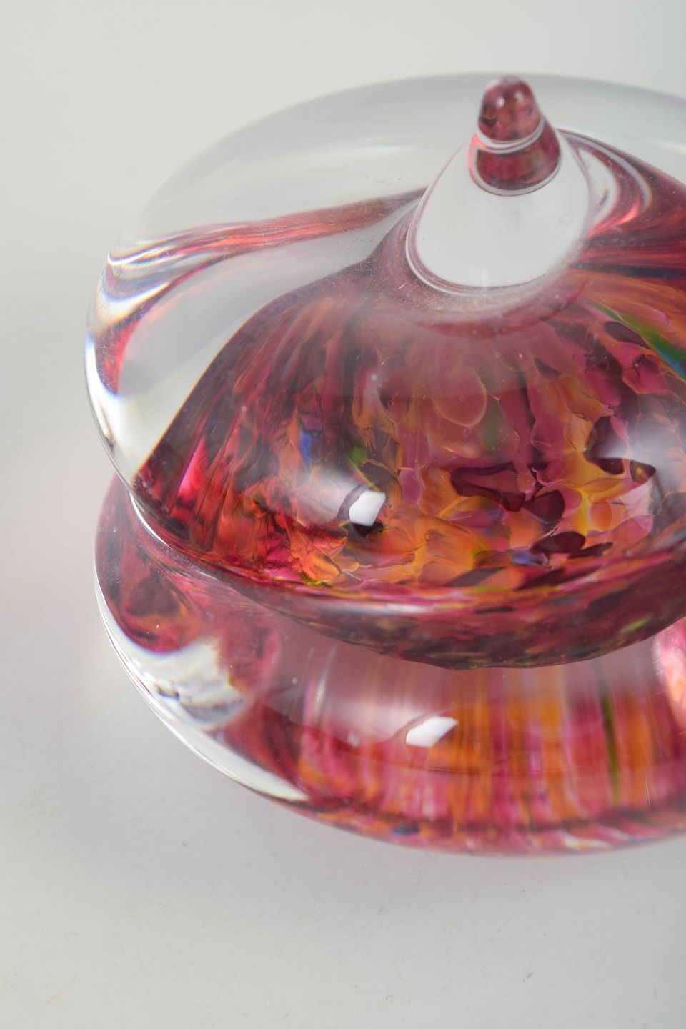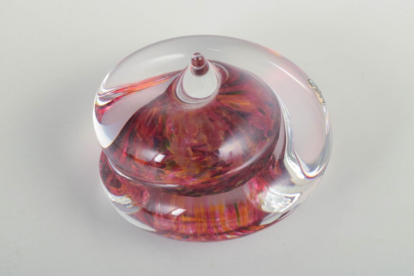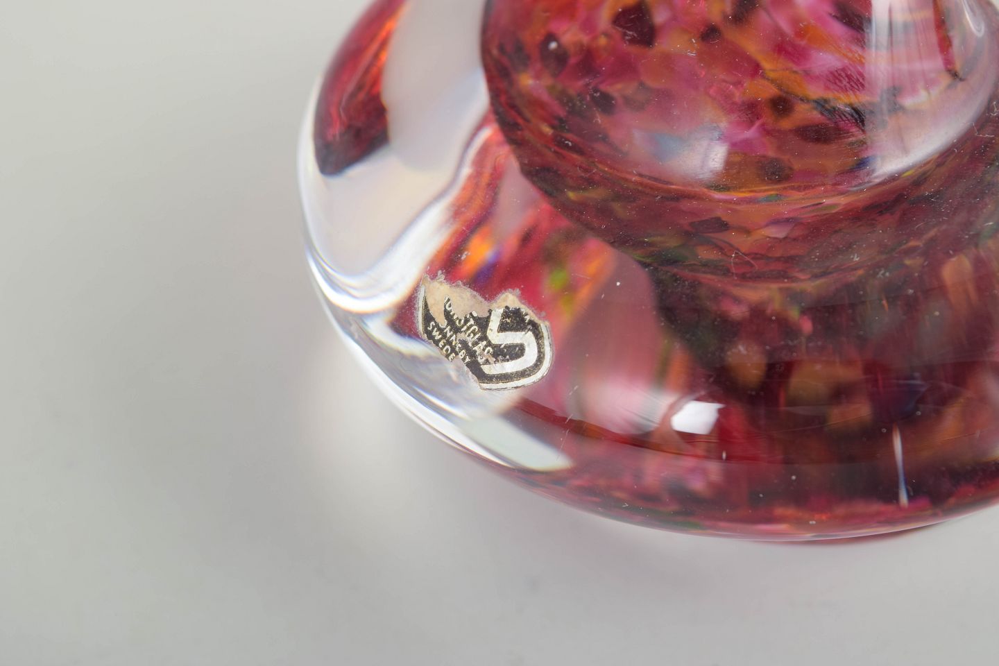Abstrakt formet skulptur i massivt kunstglas med klar yderform og indre partier i røde og rosa nuancer med spil af farveindlæg. Udført med bløde, afrundede linjer og poleret overflade. Med originalt mærkat fra FM Konstglas, Ronneby.