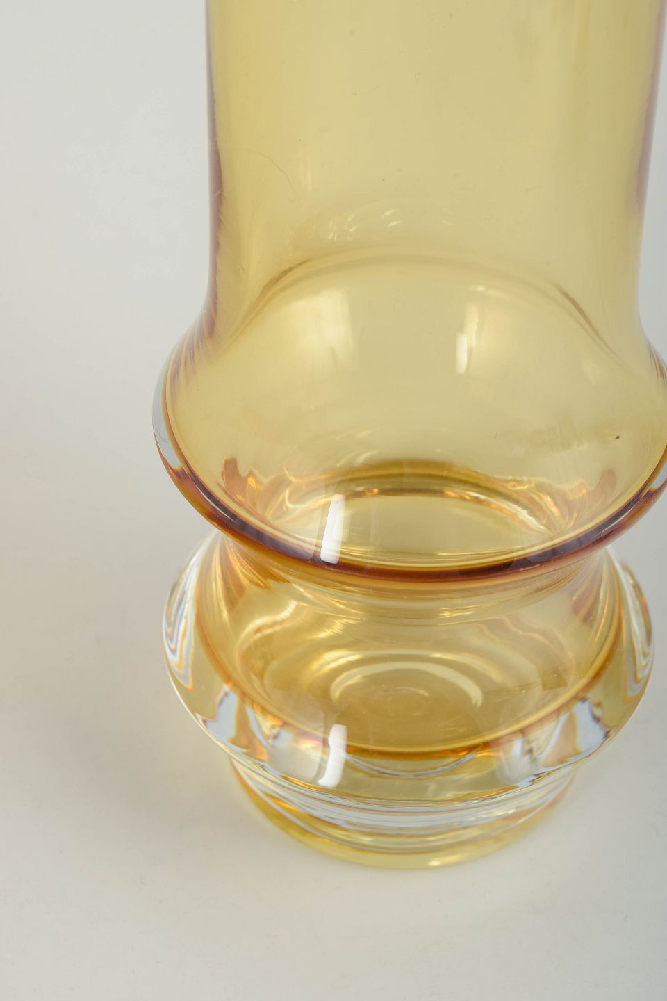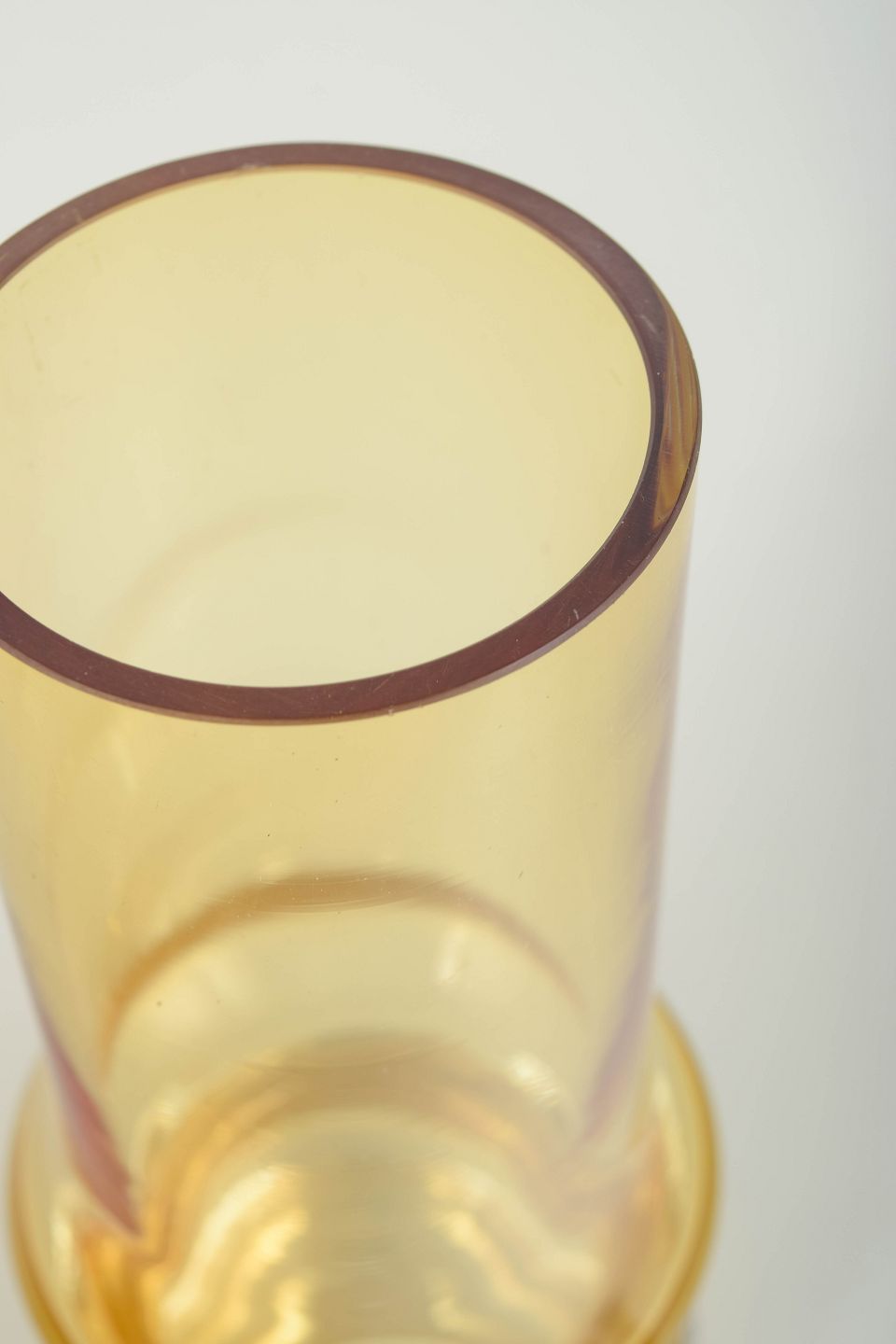 Høj cylindrisk vase i ravfarvet kunstglas med let udadbøjet munding og markant profileret fod. Udført i mundblæst glas med varm gylden tone og klar, massiv sokkel. Usigneret.