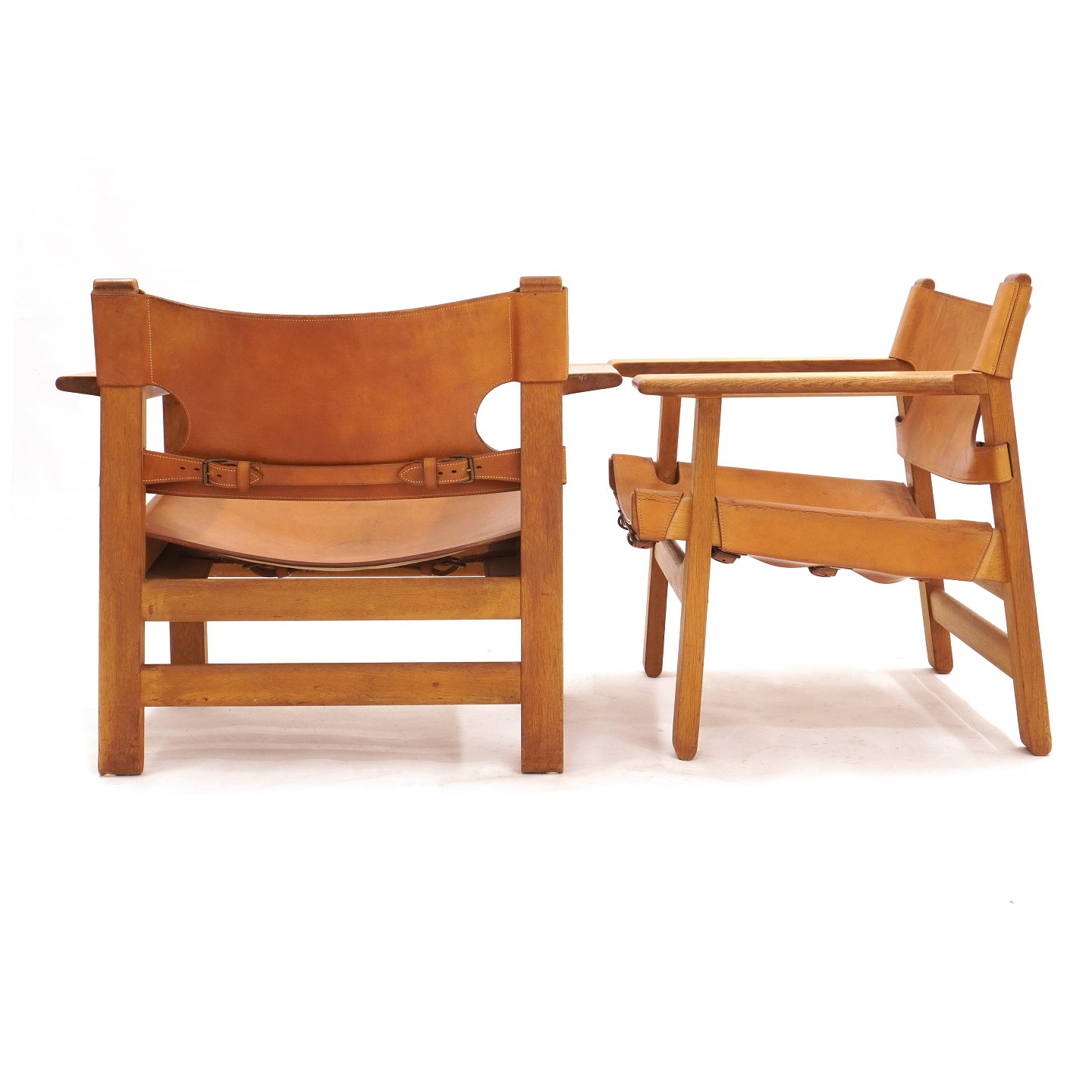 Et par Børge Mogensen Spanske Stole i tidlig version med patineret egestel og kernelæder