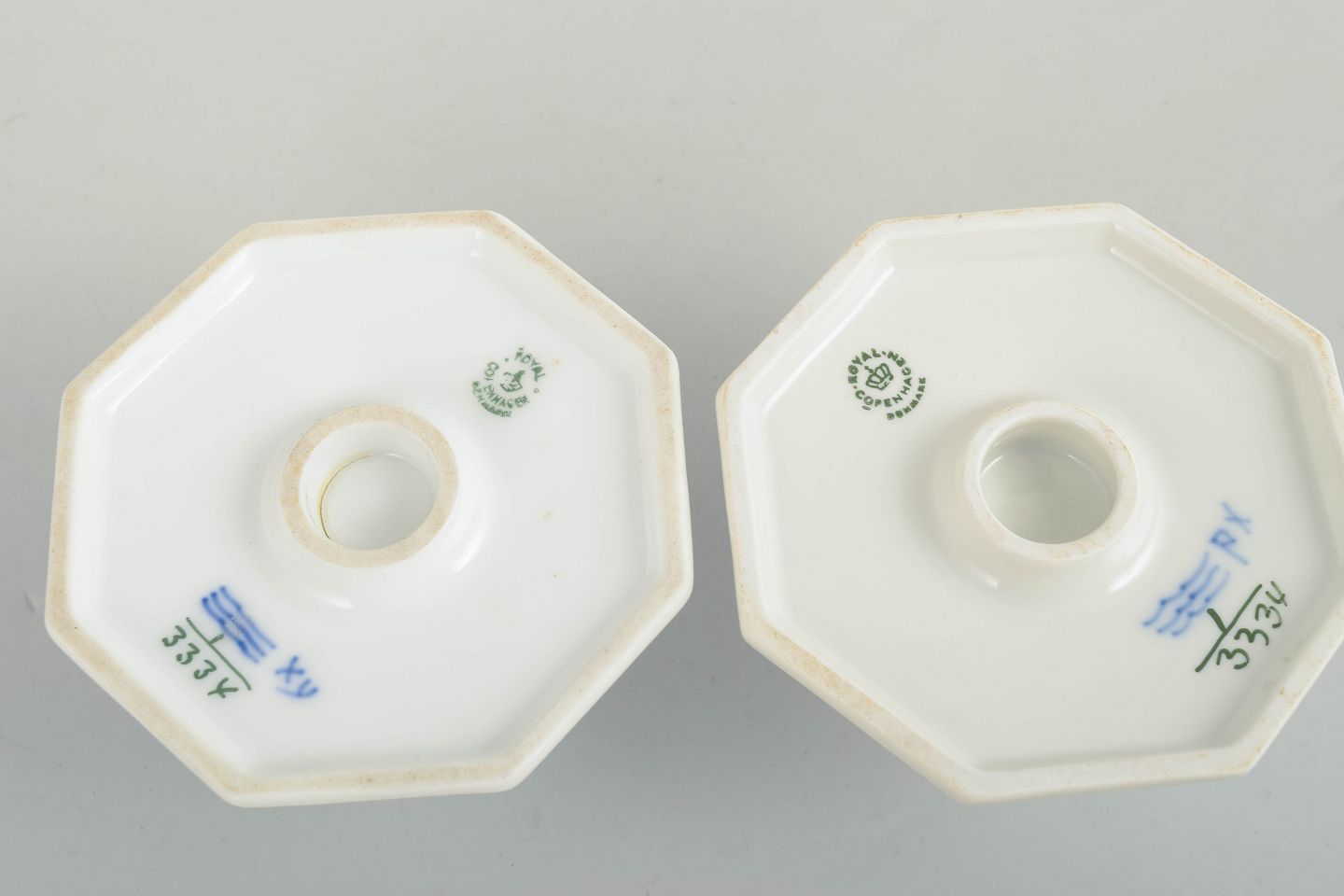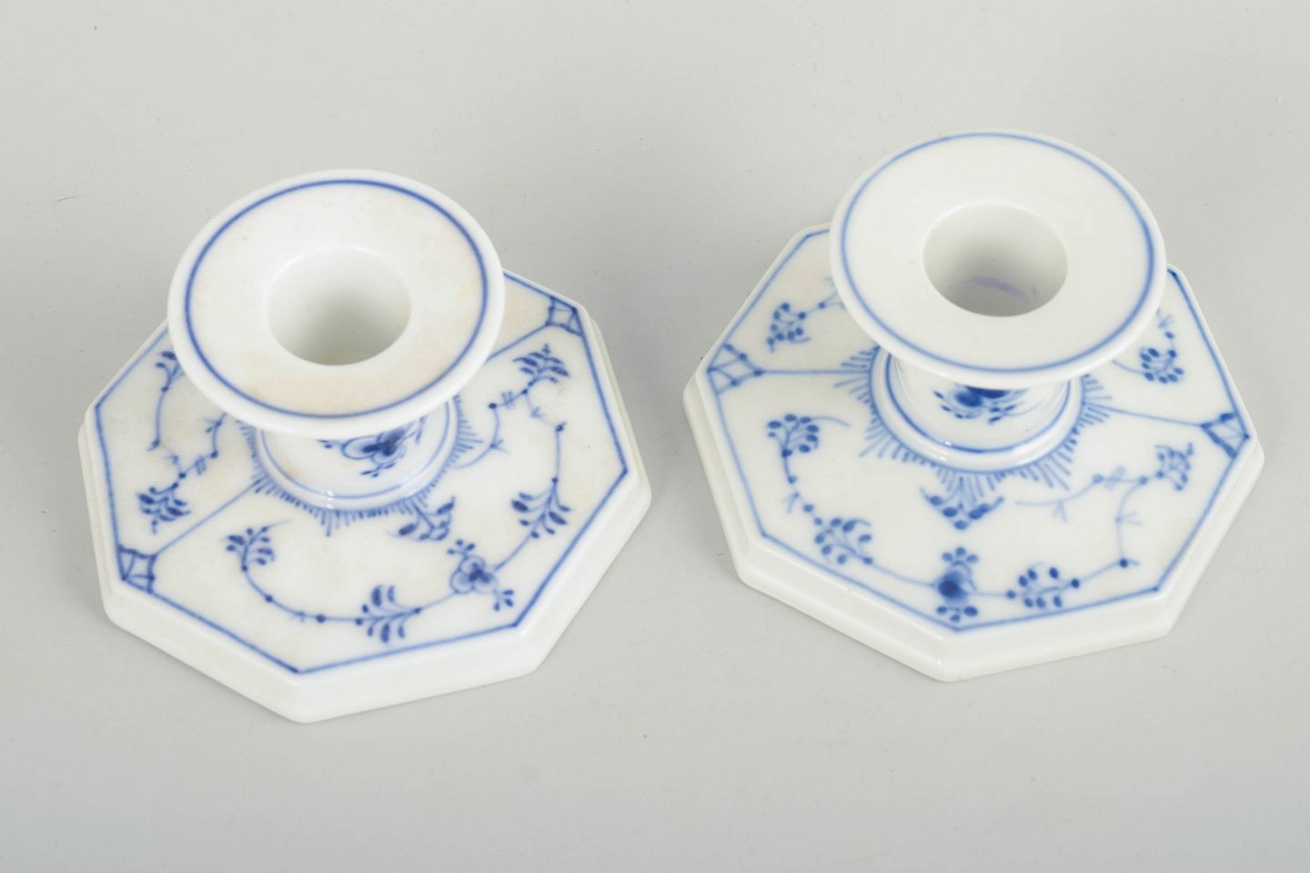 Par lysestager i håndmalet porcelæn fra Musselmalet Riflet med klassisk underglasurdekoration i koboltblå. Model 1/3334. Den ene er første sortering, den anden annulleret med én indridset streg under bunden. Fremstillet 1963.