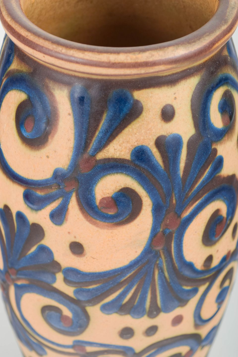 Høj, slank vase i stentøj, hånddekoreret i dyb koboltblå på varm terrakottafarvet bund. Dekorationen består af stiliserede slyngende bladranker og prikornamentik. Stemplet med indridset HAK i bunden. Fremstillet hos Kähler i 1930’erne.