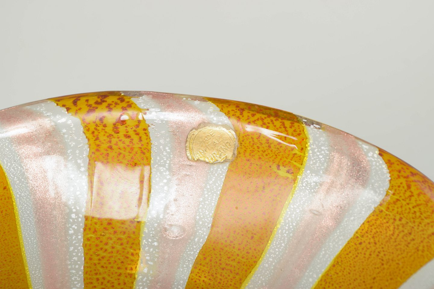 Organisk formet skål i mundblæst glas med snoet rand. Udført i varme gule og hvide striber, aventurin teknik, og iriserende effekt. Mærkat bevaret. Fremstillet på Murano i 1960’erne/70’erne.