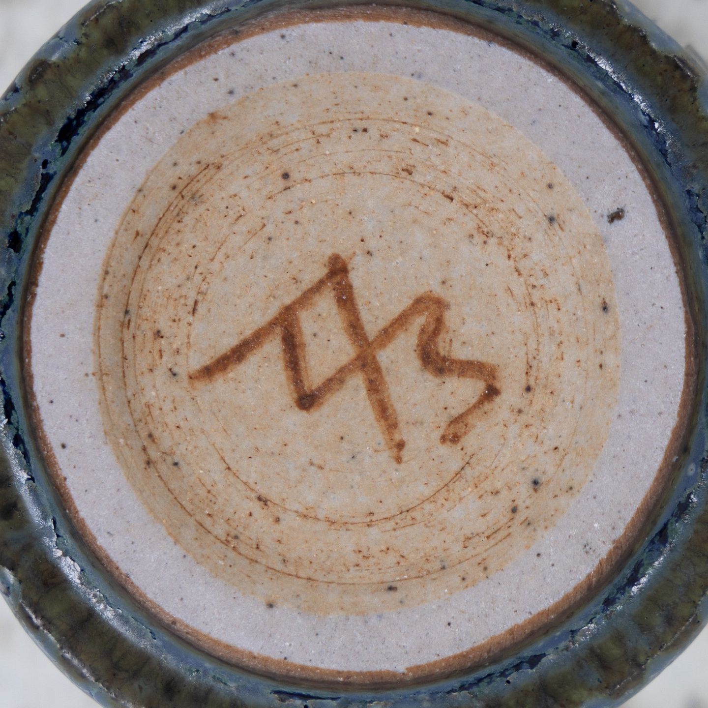 Krukke i riflet stentøj med blågrøn glasur. Signeret.