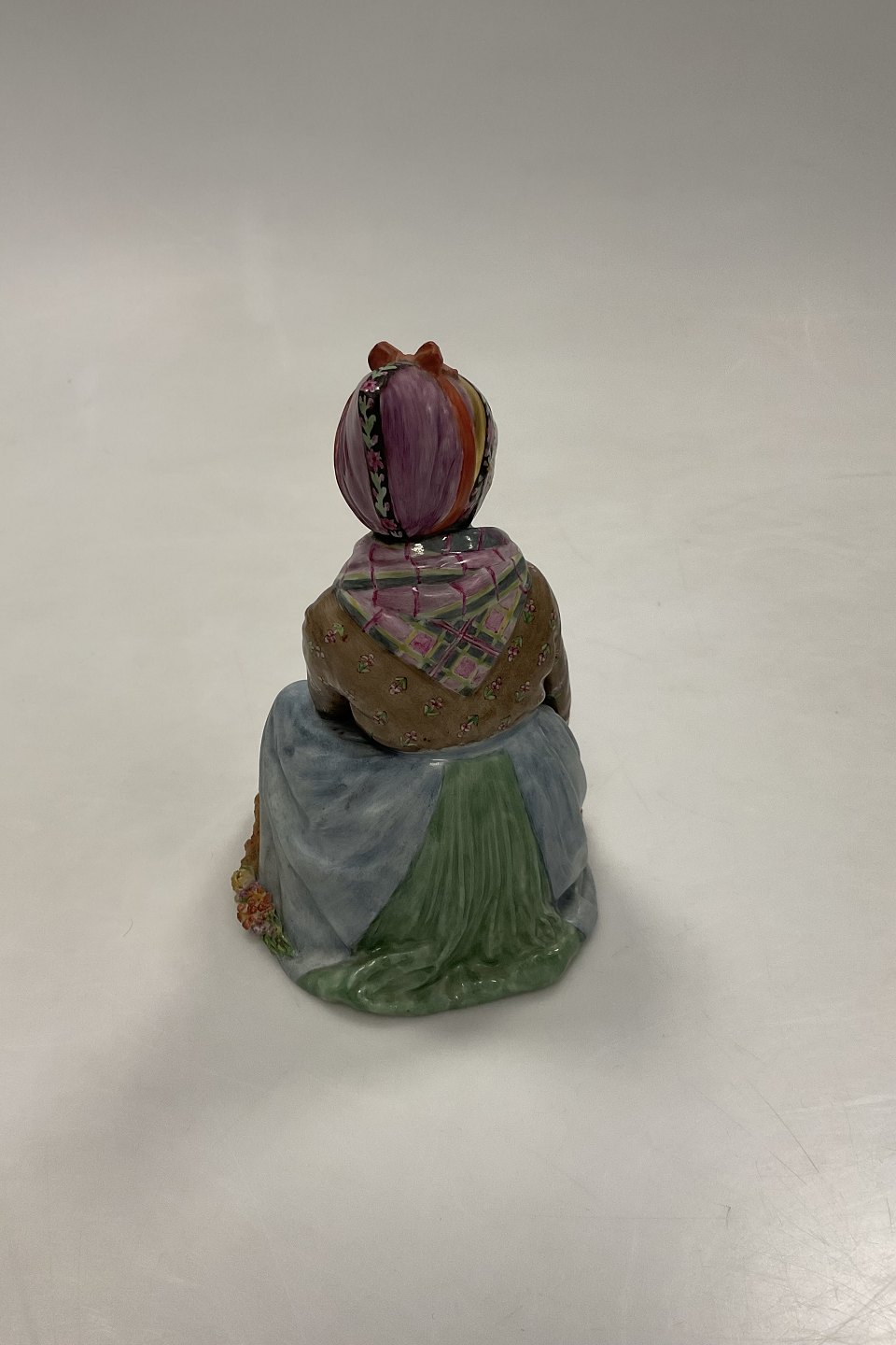 Royal Copenhagen Siddende Fanøpige af Carl Martin-Hansen No 12413. Med Juliane Marie stempel. Måler 14,5 cm. 1. sortering, med små¨afslag på blomster - se billeder
