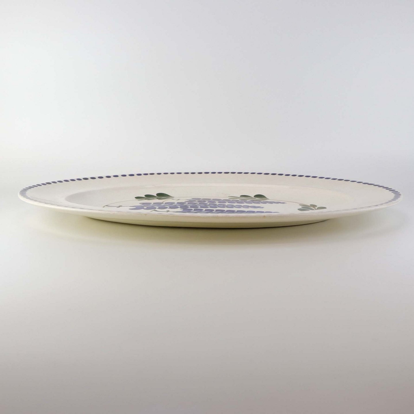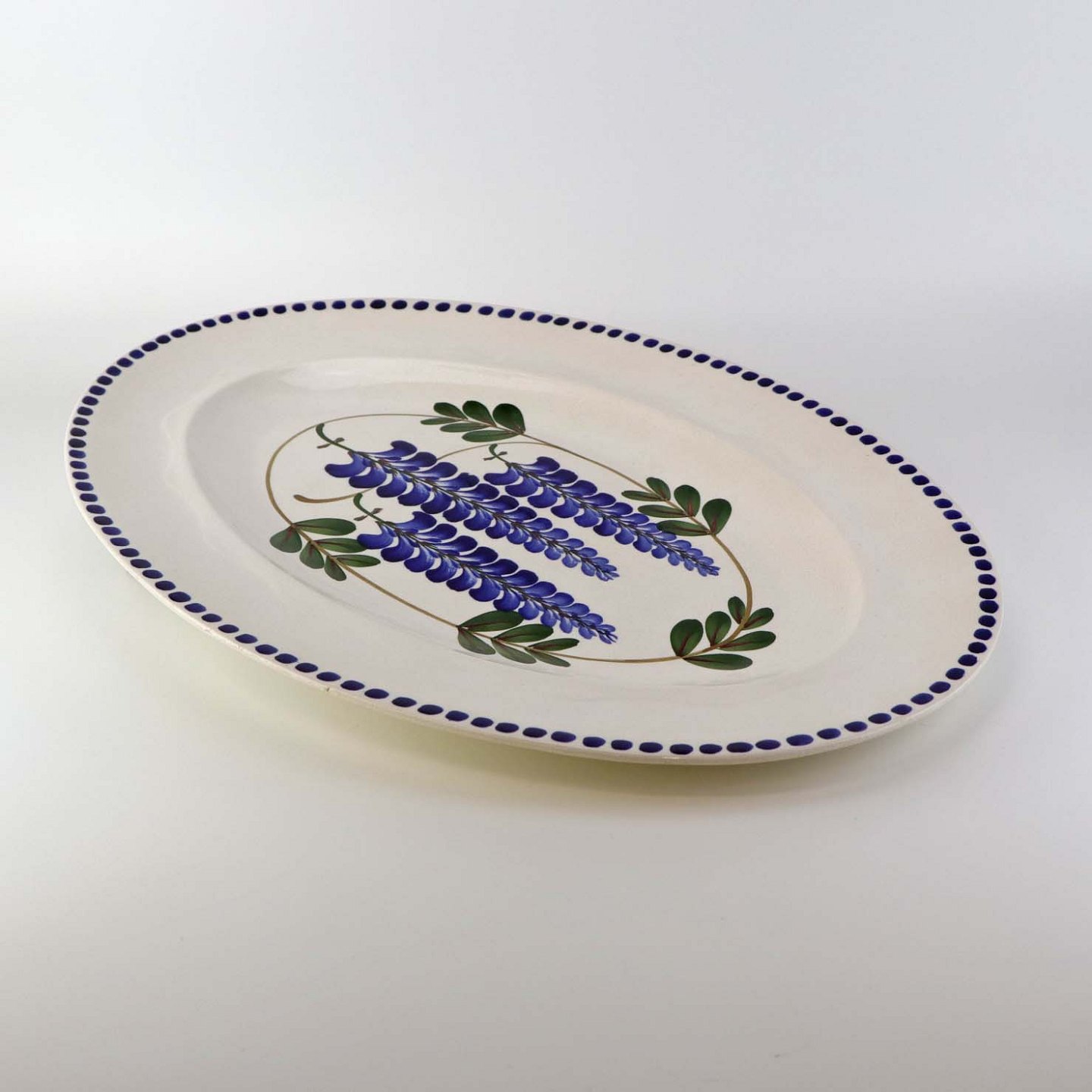 Stort ovalt serveringsfad i fajance fra stellet Blåregn. Stellet er fremstillet i perioden år 1903-1933. Nr. 522/493