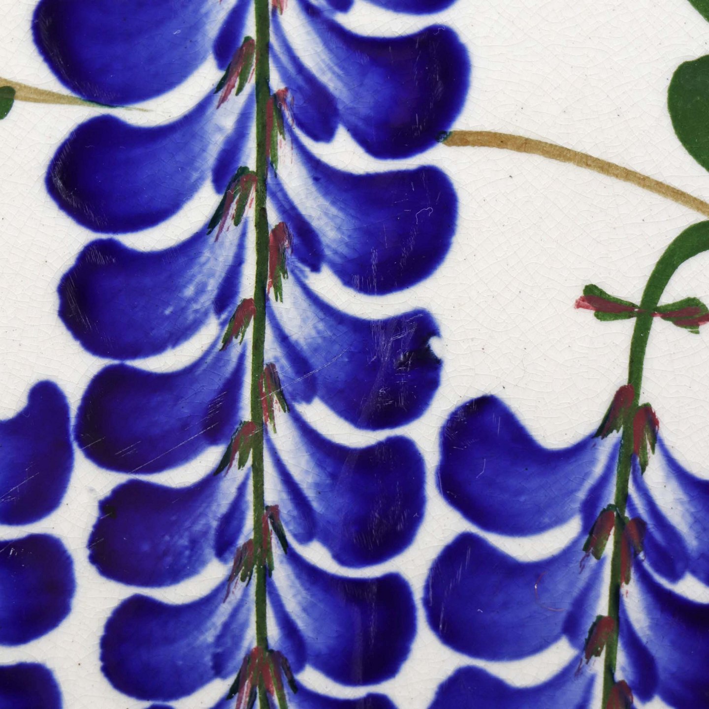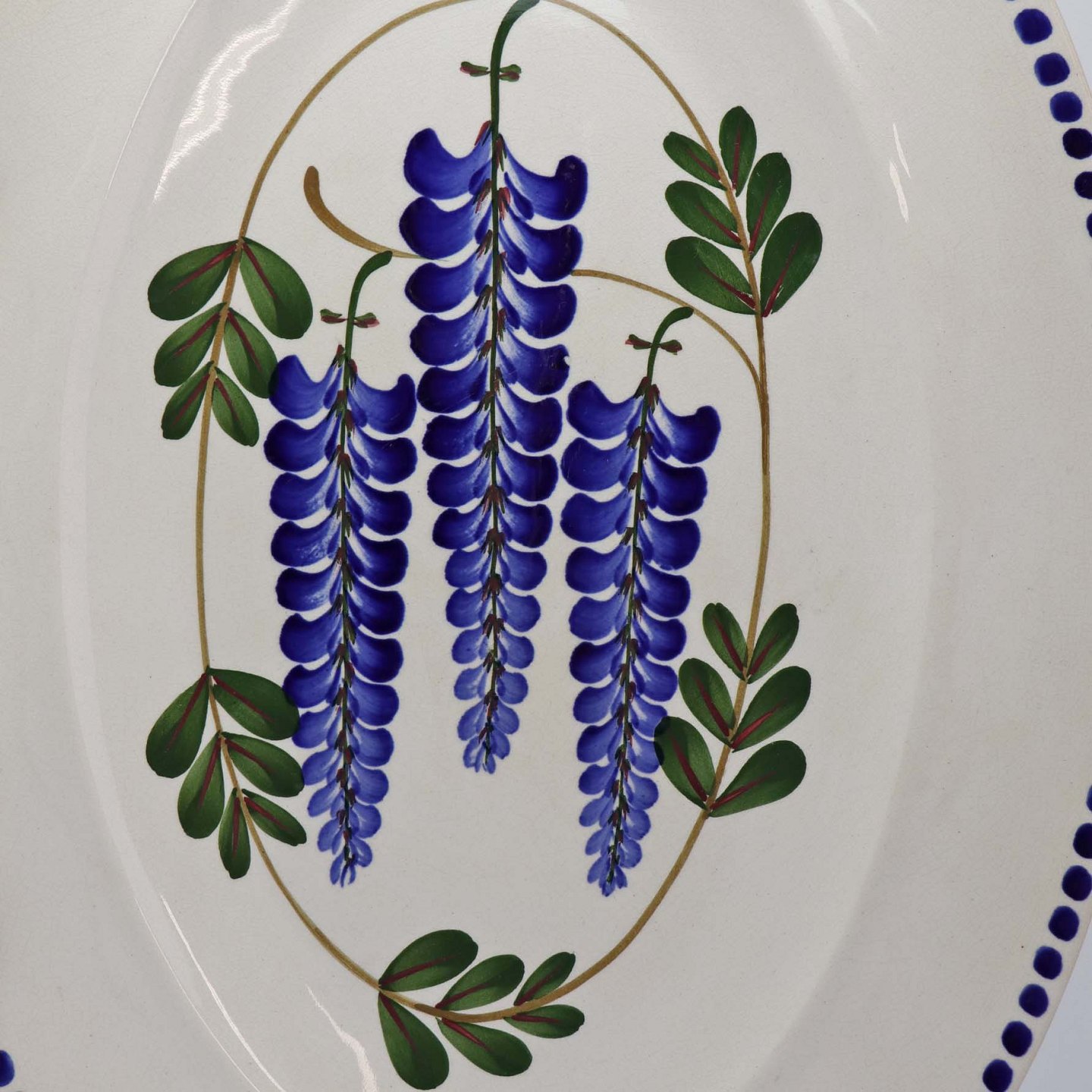 Fajancestel med dekoration af ranker af blåregn og blade på lys baggrund afsluttet med kant af runde blå pletter.