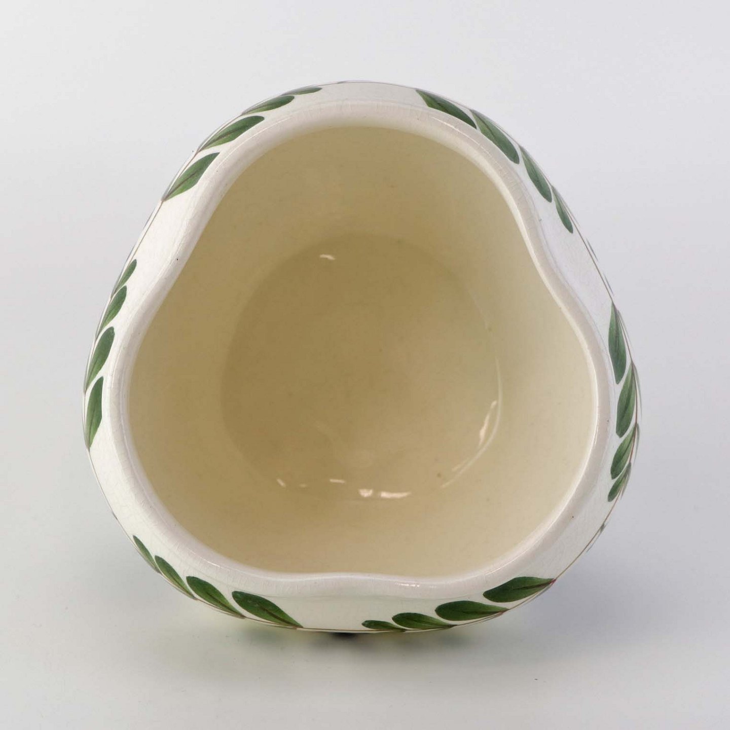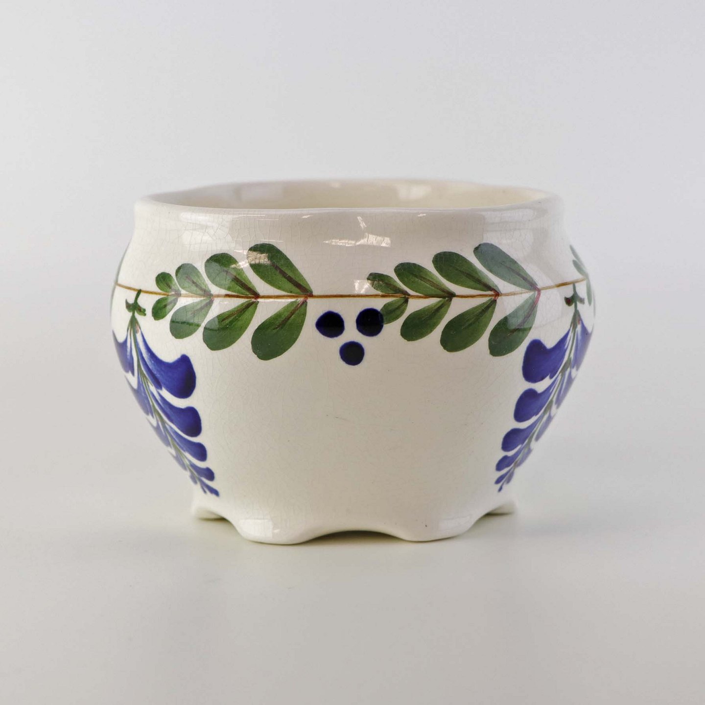 Lav trekantet vase i fajance fra stellet Blåregn. Stellet er fremstillet i perioden år 1903-1933. Nr. 522/112