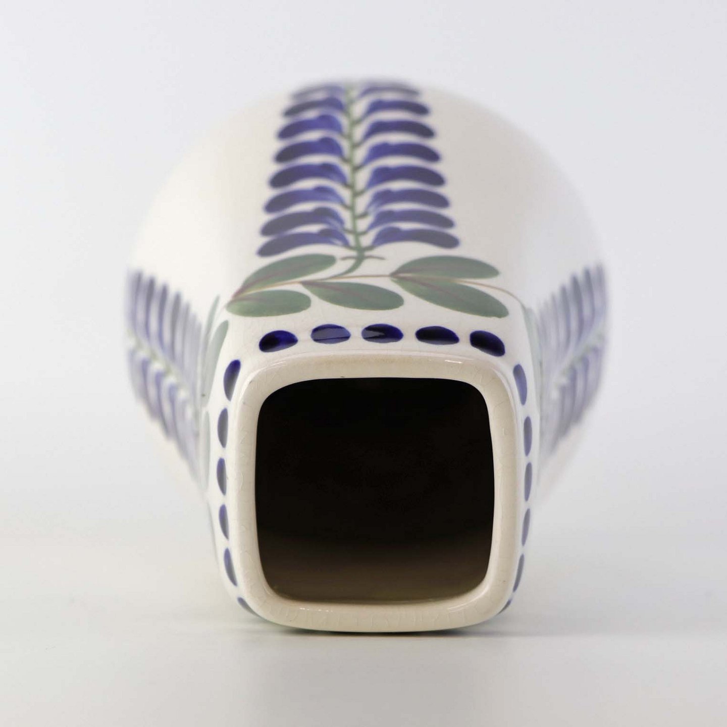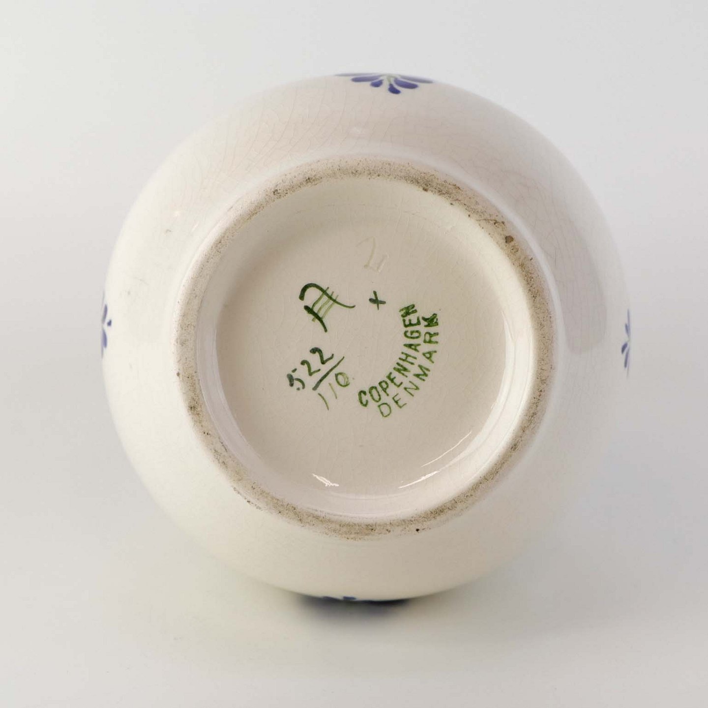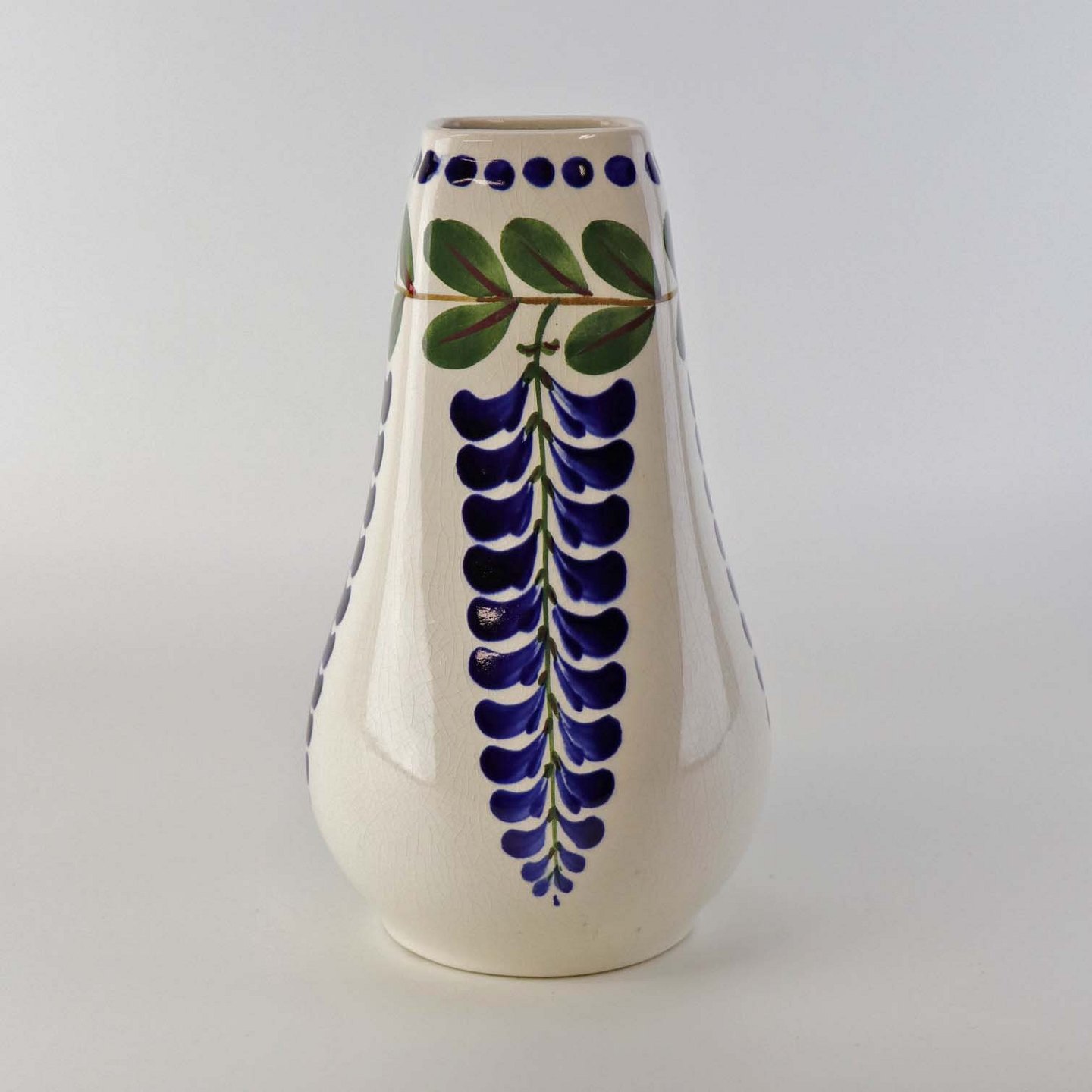 Høj vase i fajance med kantet hals fra stellet Blåregn. Stellet er fremstillet i perioden år 1903-1933. Nr. 522/110