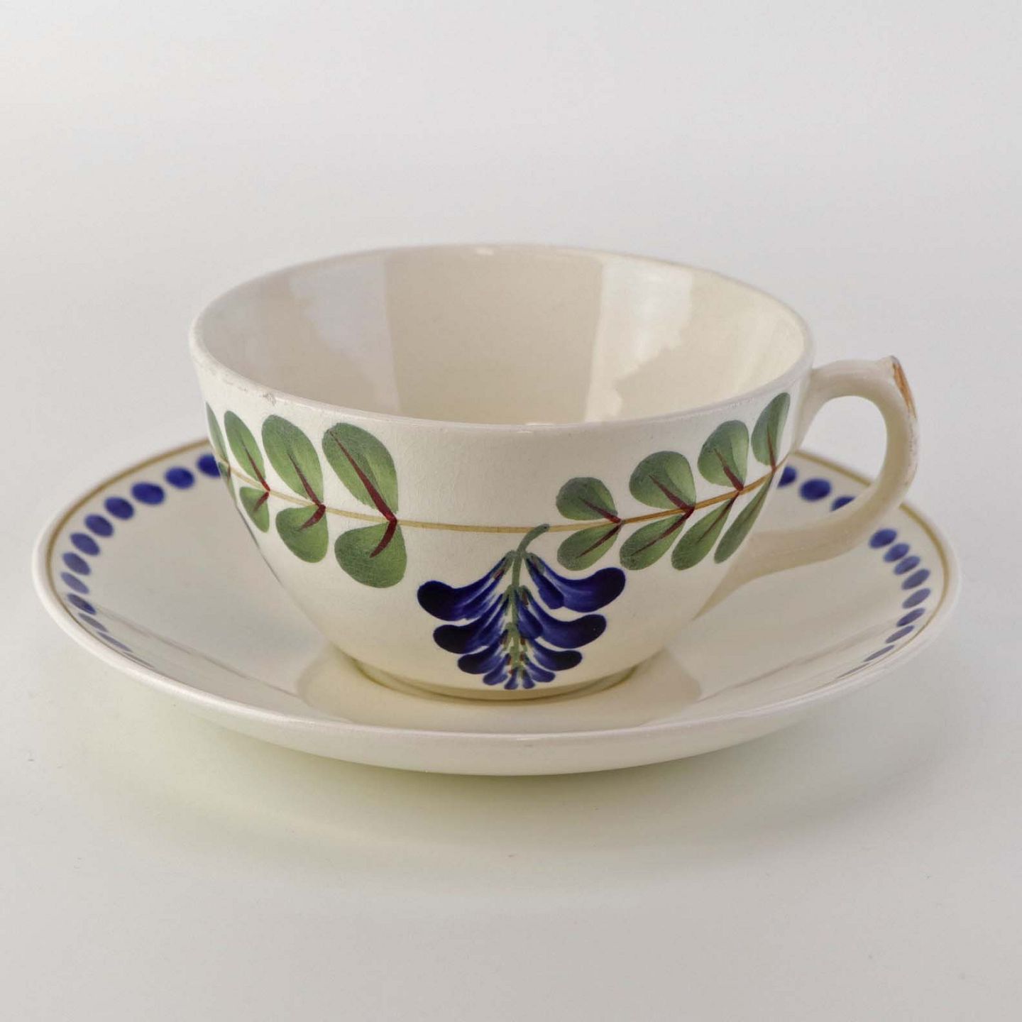 Tekop med underkop i fajance fra stellet Blåregn. Stellet er fremstillet i perioden år 1903-1933. Nr. 522/1756