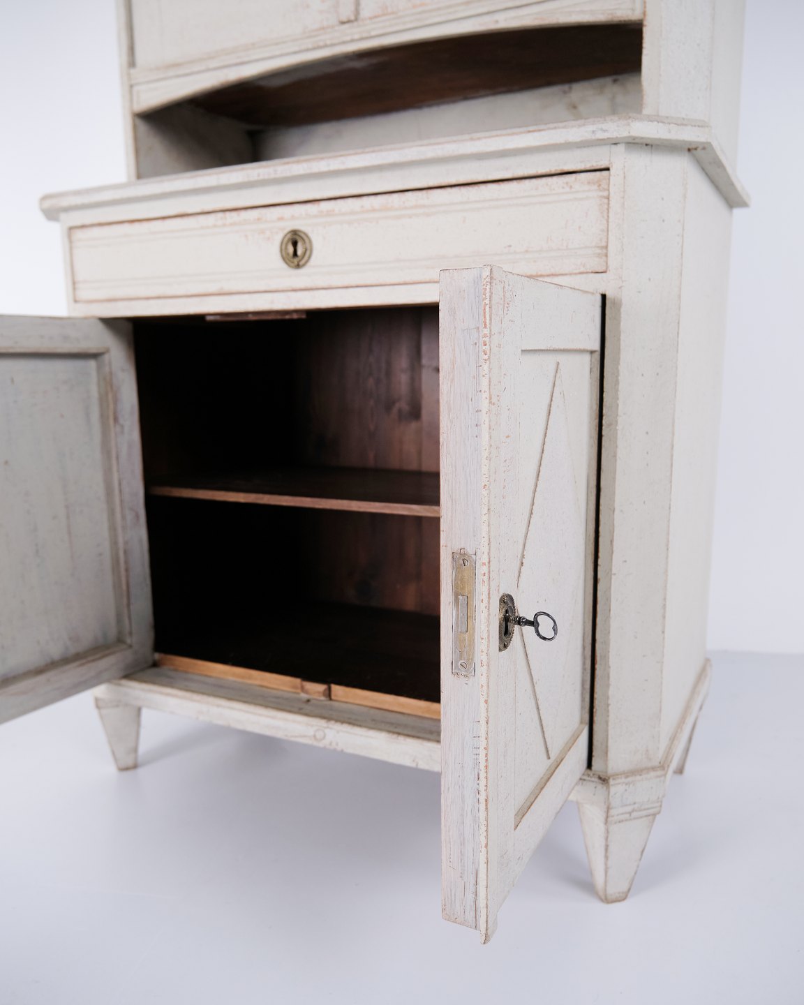 Stort svensk vitrineskab fra gustaviansk periode ca. 1790’erne. Glaslåger, hylder og skuffe.