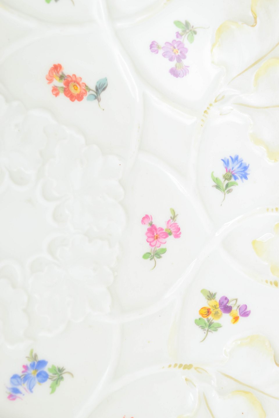 Stort rundt fad i porcelæn med reliefdekoration og håndmalede blomster i polykrome farver samt forgyldt kant.