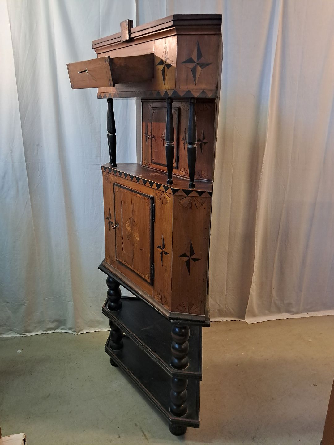 Hjørneskab i ege og elmetræ, det har 200 års jubilæum