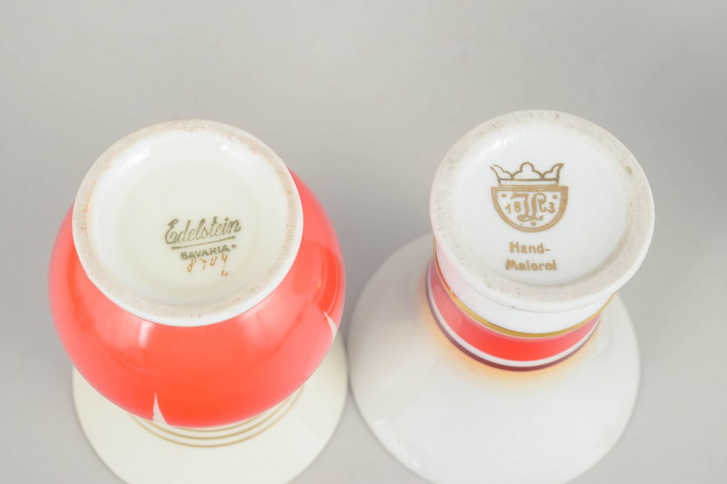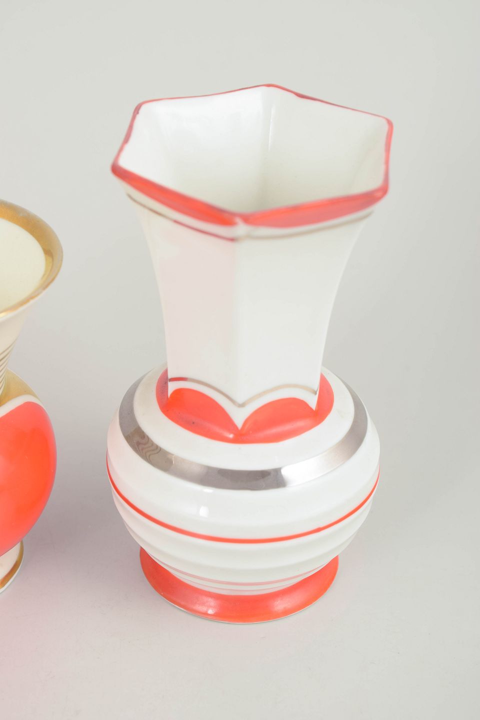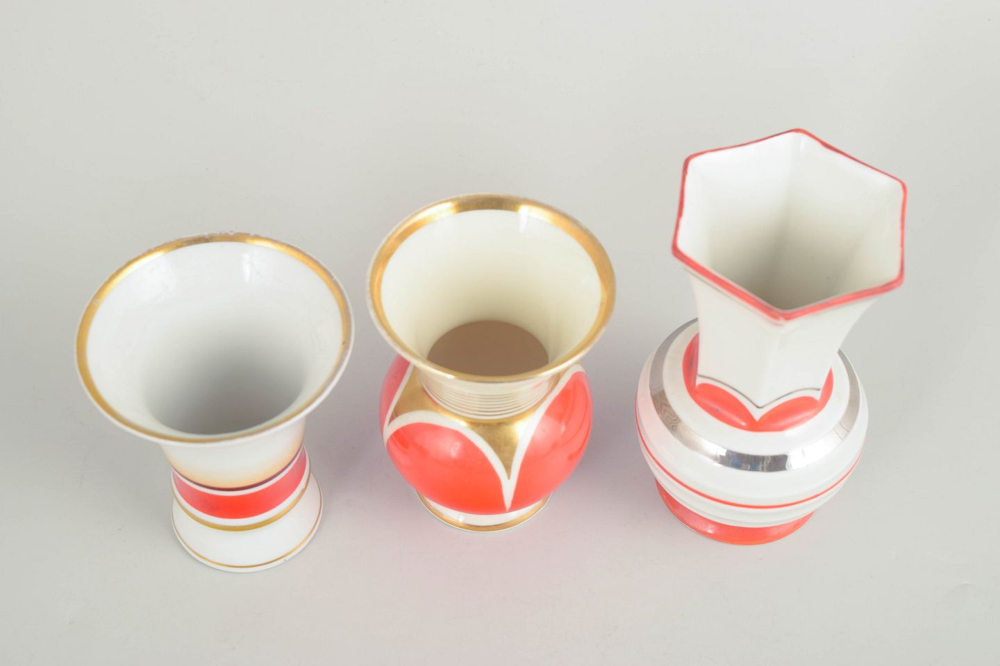 Tre små vaser i porcelæn med klassiske art deco former og dekoration i hvide og koralrøde nuancer med stafferinger i guld. Vaserne har elegante proportioner og karakteristisk stil fra tysk porcelænsproduktion i mellemkrigstiden.