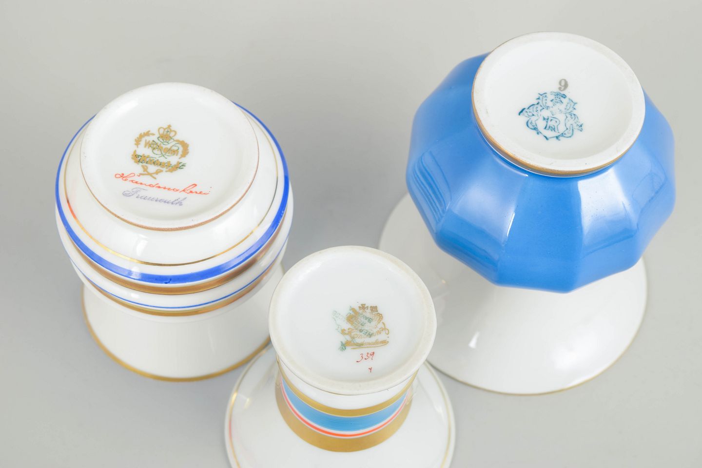 Tre små vaser i porcelæn med klassiske art deco former og dekoration i blå og hvide nuancer med stafferinger i guld. Vaserne fremstår med elegante proportioner og karakteristisk stil fra tysk porcelænsproduktion i mellemkrigstiden.