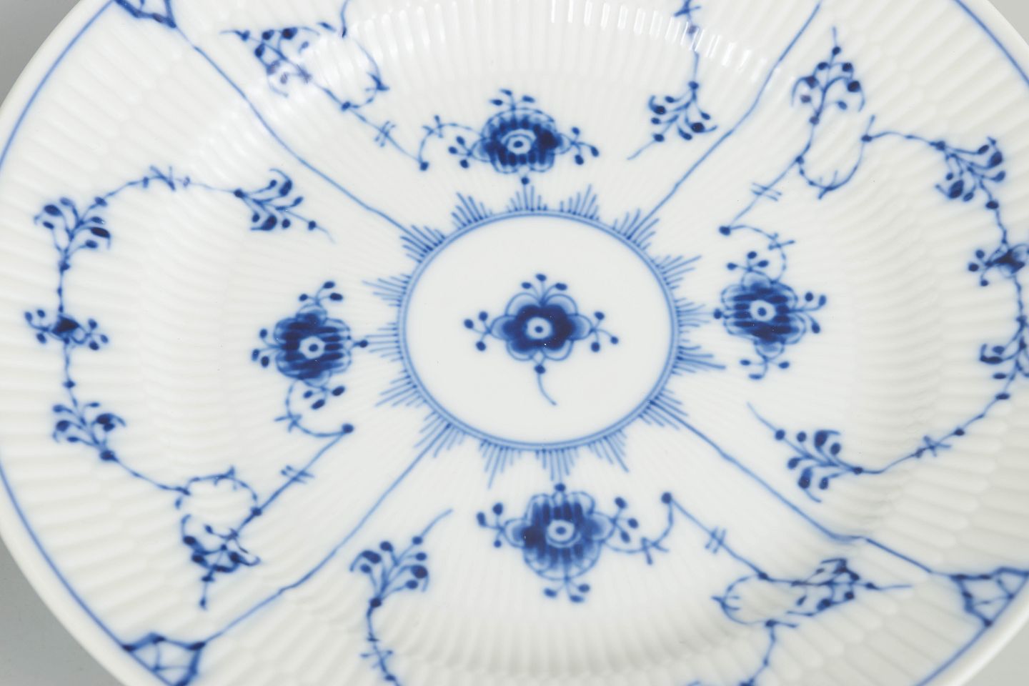 Royal Copenhagen blev grundlagt i 1775 i København under kongelig bevilling. Fabrikken er internationalt anerkendt for sit håndmalede porcelæn og sit høje kunstneriske niveau. Musselmalet Riflet er fabrikkens mest klassiske stel, introduceret i slutningen af 1700-tallet og fortsat produceret med traditionelle håndværksmetoder.