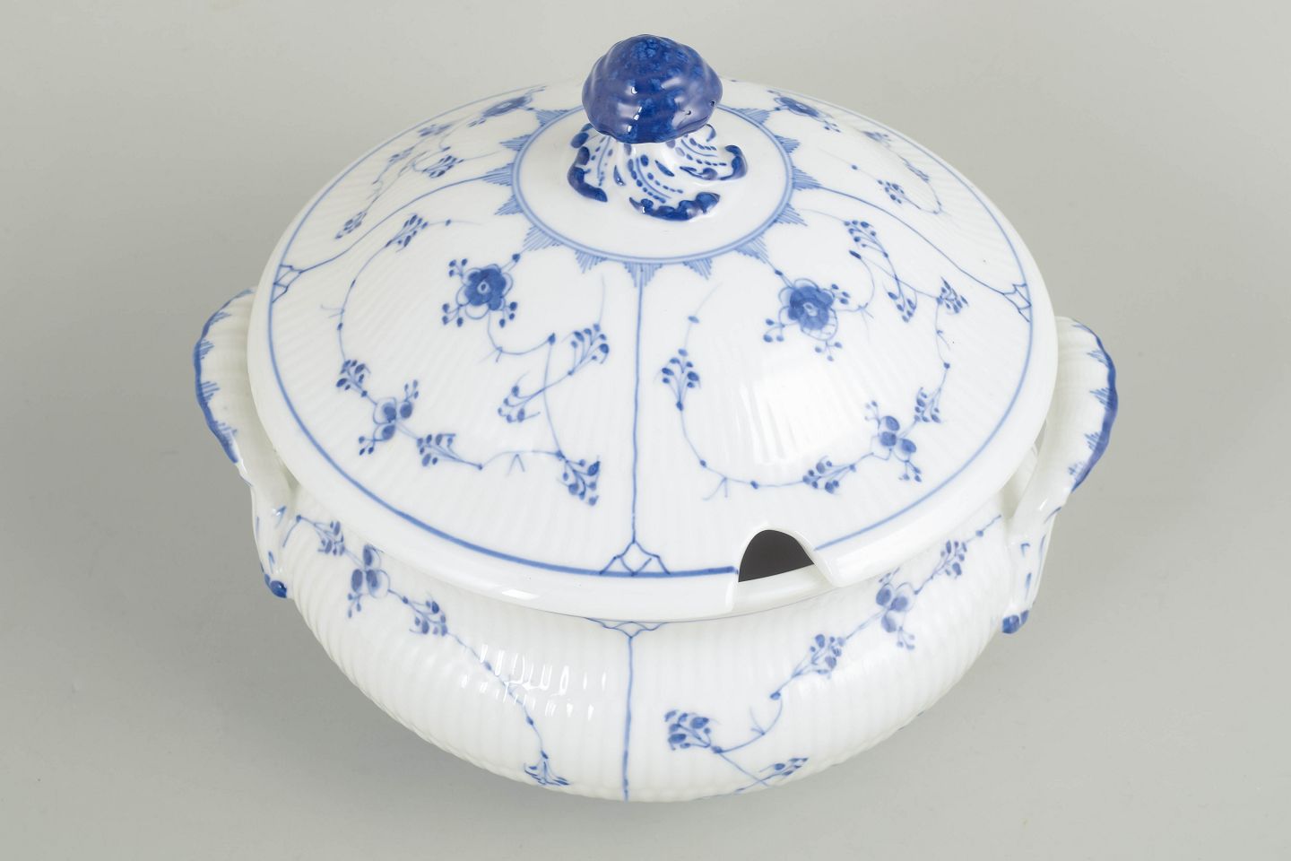Stor suppeterrin med låg i håndmalet porcelæn fra Musselmalet Riflet med klassisk underglasurdekoration i koboltblå og riflede felter. Model 1/222. H. 23 cm, D. 26 cm. Første sortering. Fremstillet omkring 1900.