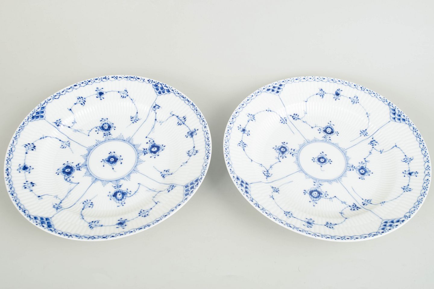 To middagstallerkener i håndmalet porcelæn fra Musselmalet Halvblonde med klassisk underglasurdekoration i koboltblå og karakteristisk blondekant. Model 1/571. Annulleret med én indridset streg under bunden. Fremstillet i 1968.